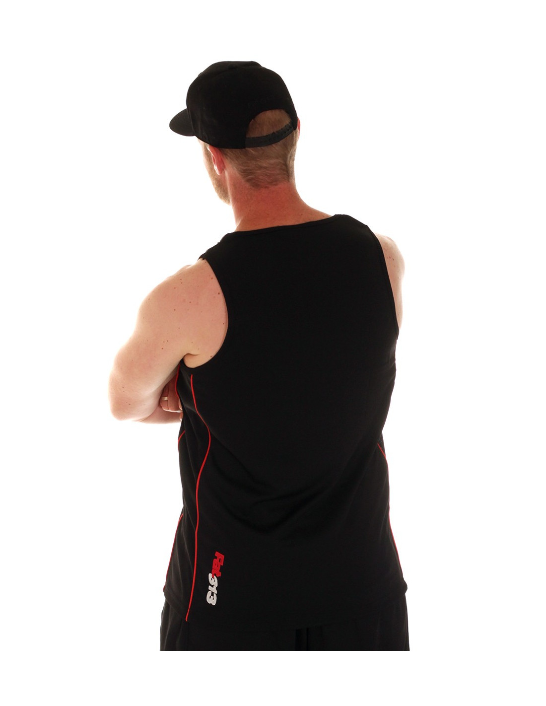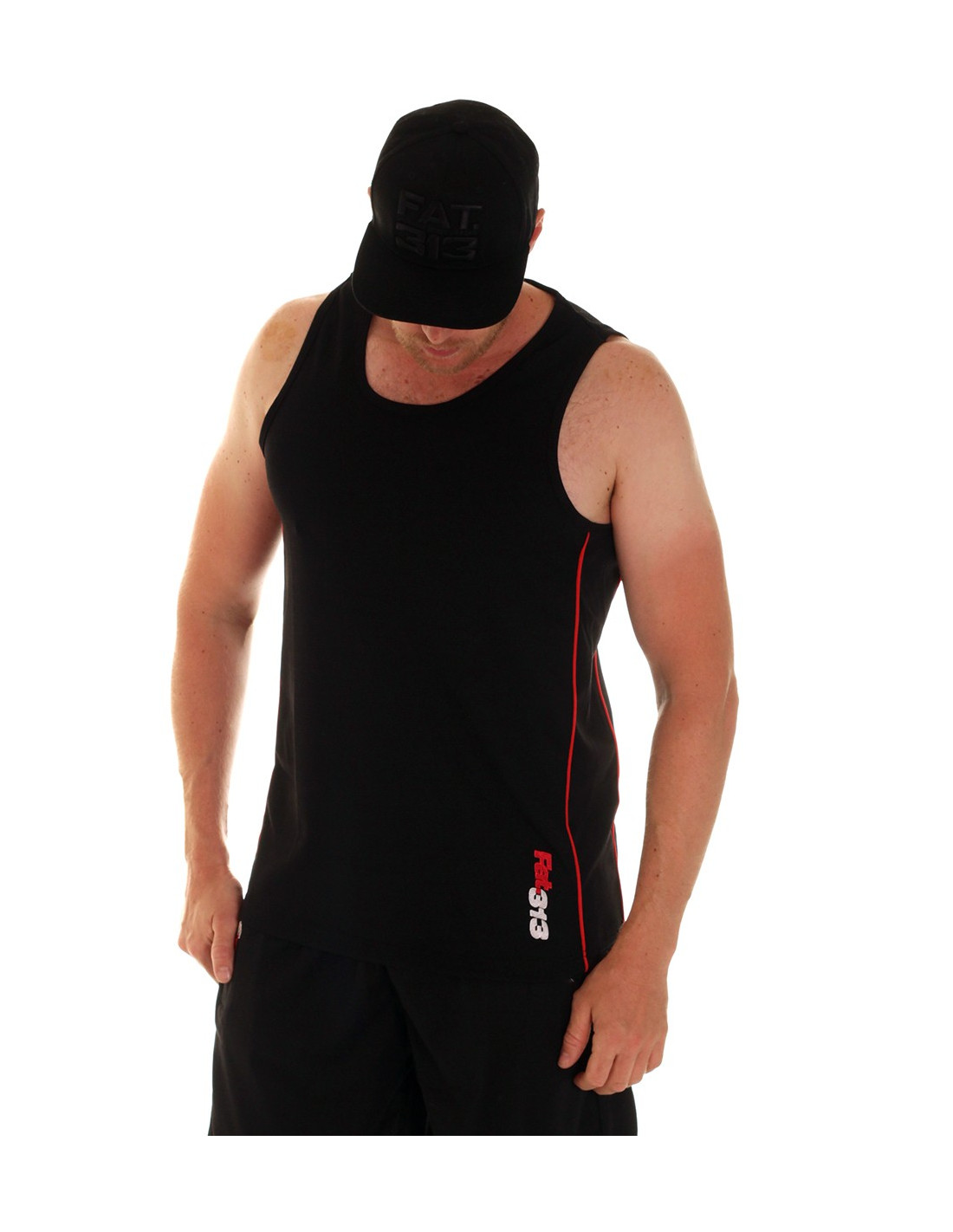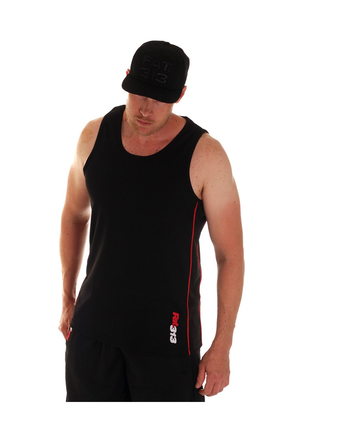Casual street meshTanktop fra Premium Fashionbrandet FAT313. Tanktoppen er i sort mesh materiale, med sorte sidepaneler, som er indrammet af røde striber. Det kendte rød-hvide Forrester logo er stitchet ned langs den røde stribe foran og bagpå. En sporty og stilet tanktop til alle, der er nede med en casual street stil.