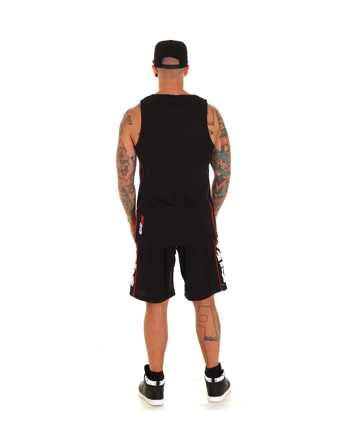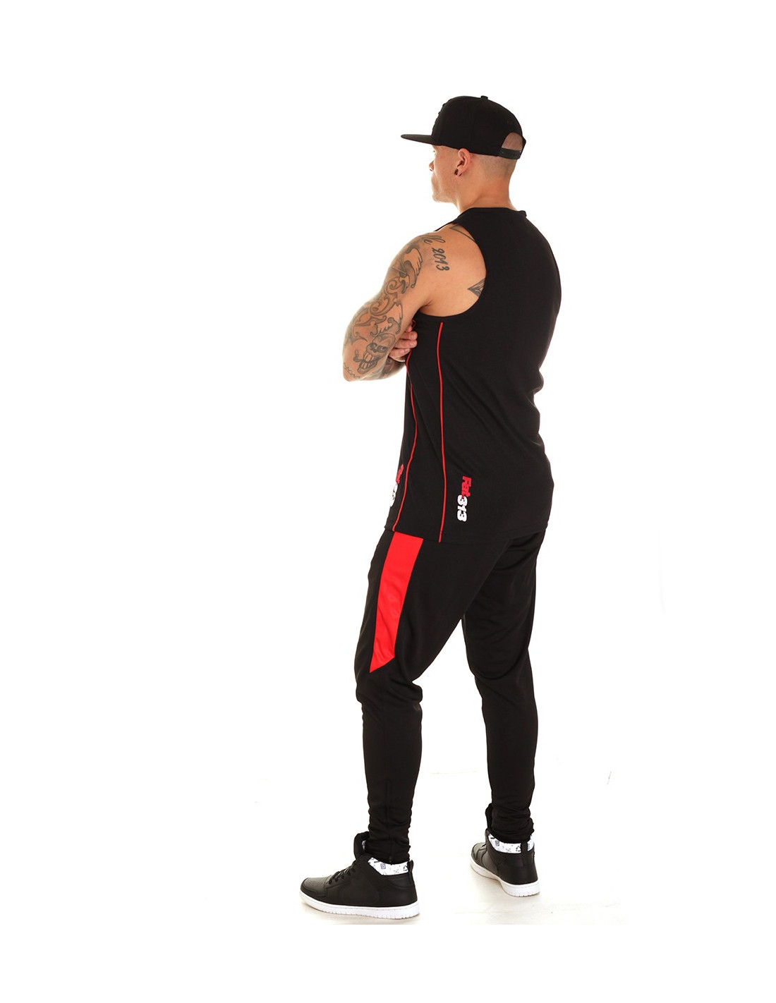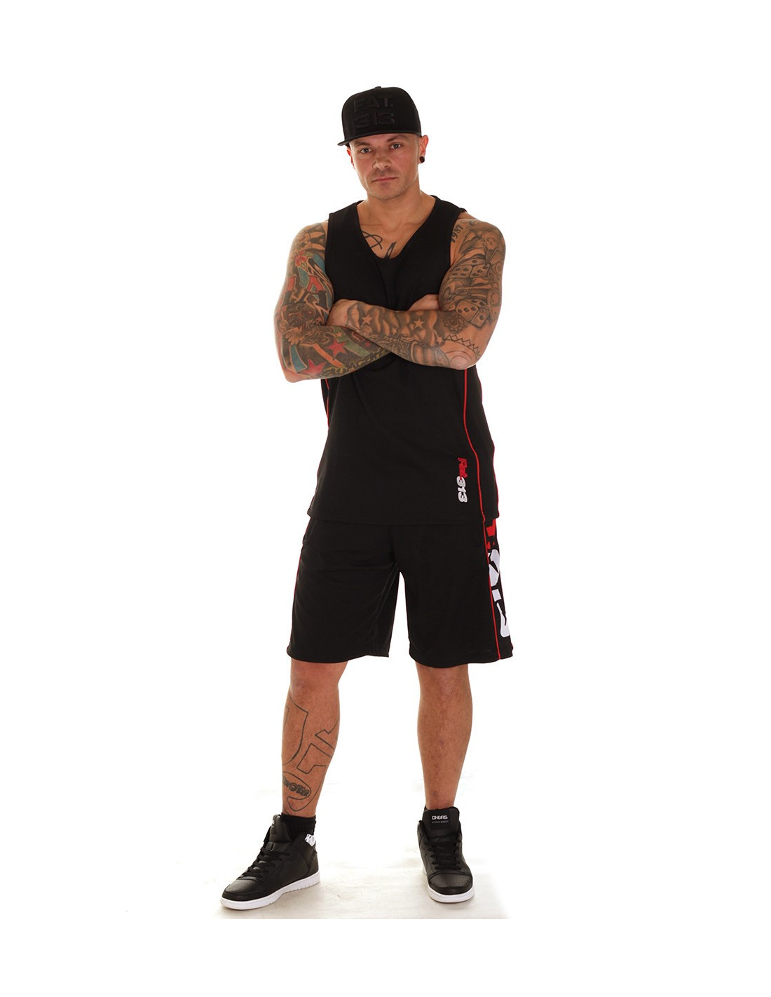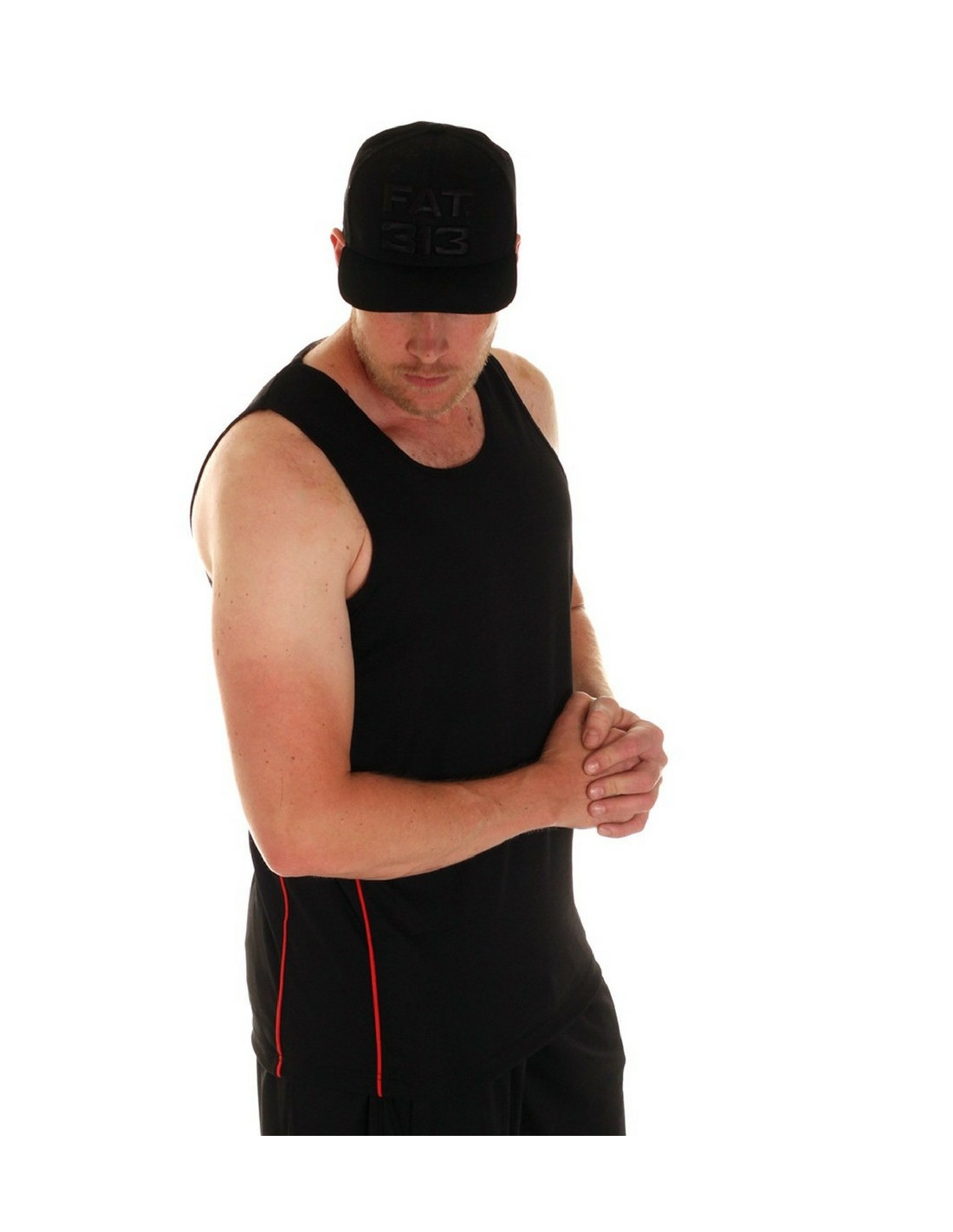 Casual street meshTanktop fra Premium Fashionbrandet FAT313. Tanktoppen er i sort mesh materiale, med sorte sidepaneler, som er indrammet af røde striber. Det kendte rød-hvide Forrester logo er stitchet ned langs den røde stribe foran og bagpå. En sporty og stilet tanktop til alle, der er nede med en casual street stil.