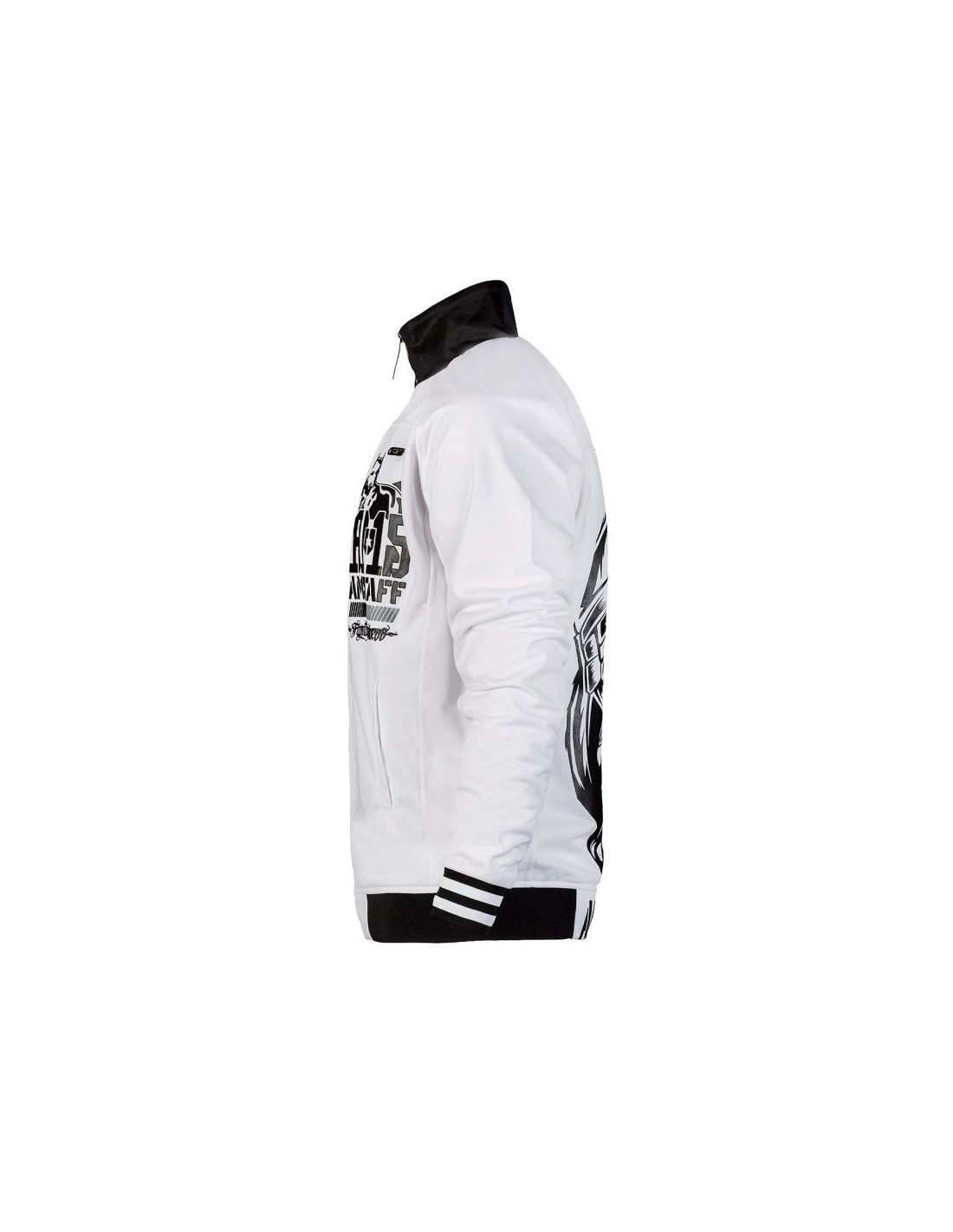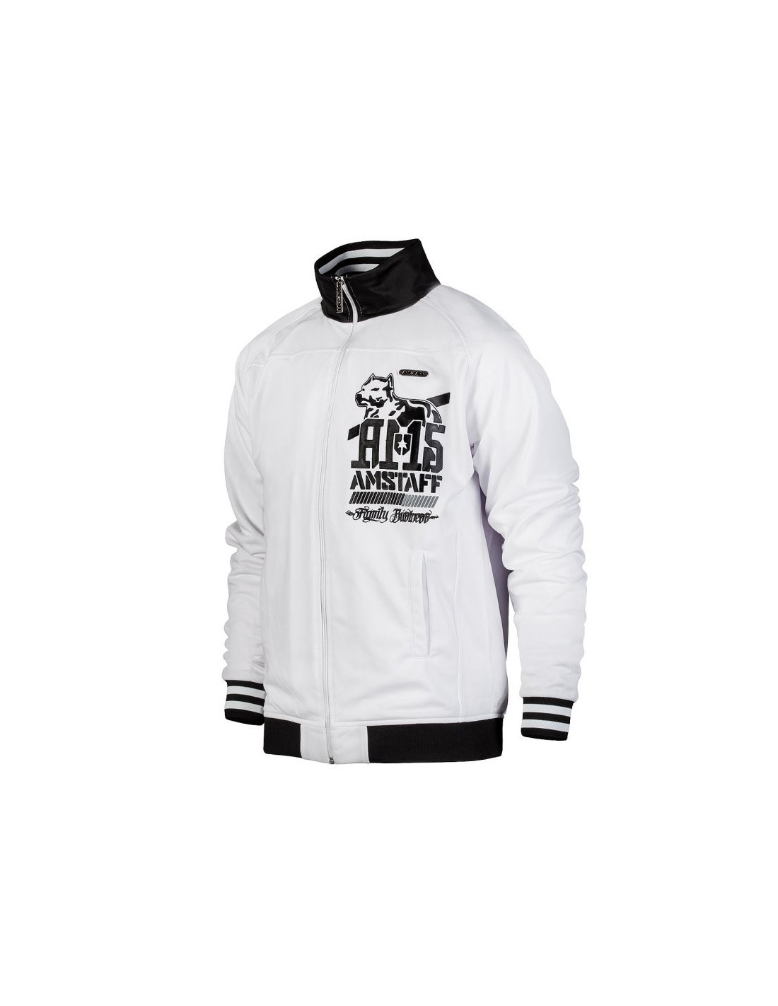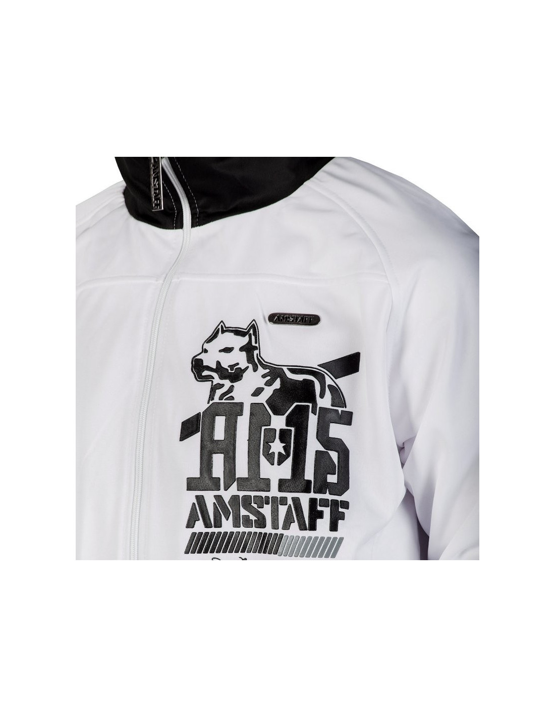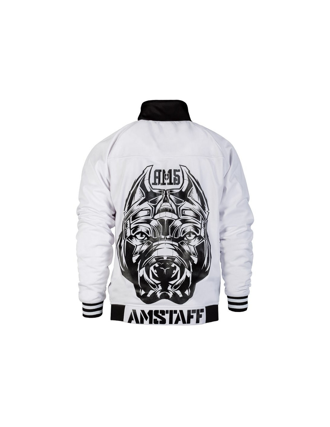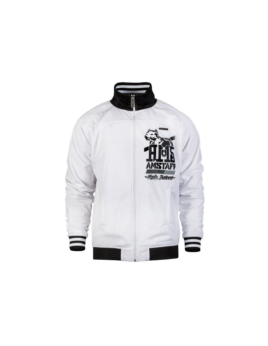 Stilet hvid Trackjacket til alle, der er nede med Amstaff. På brystet er placeret et mindre sort brandlogo og på ryggen et stort iøjnefaldende hundelogo. Den hvide Trackjacket får ekstra kant af en sort/hvide bord på ærmerne og en sort kant i halsen og forneden. Forneden bliver den sorte kant brudt af brandvnat. Det ser virkelig godt ud. Et toptrendy, lækker og muskuløst produkt fra vores Dogzdepartement.