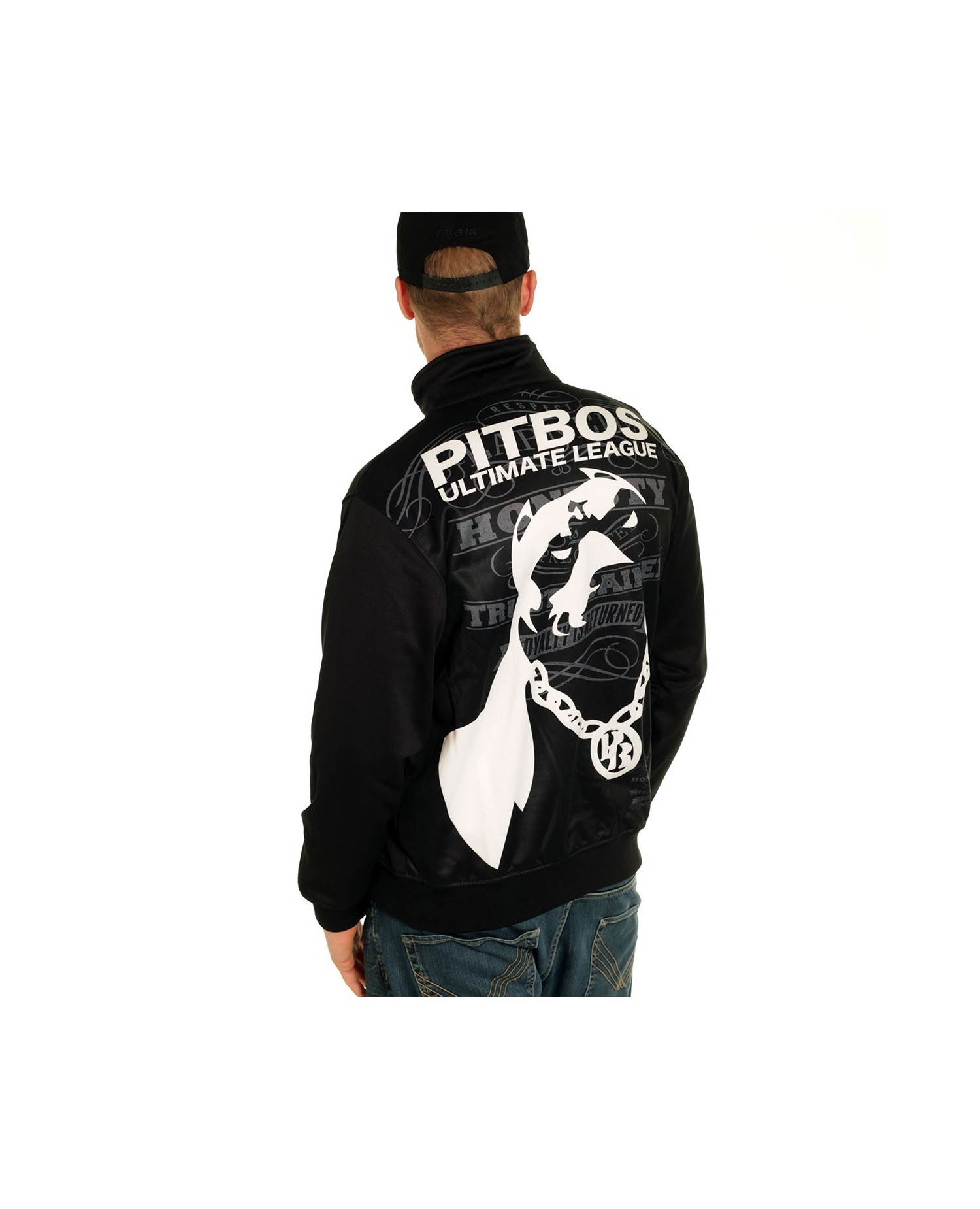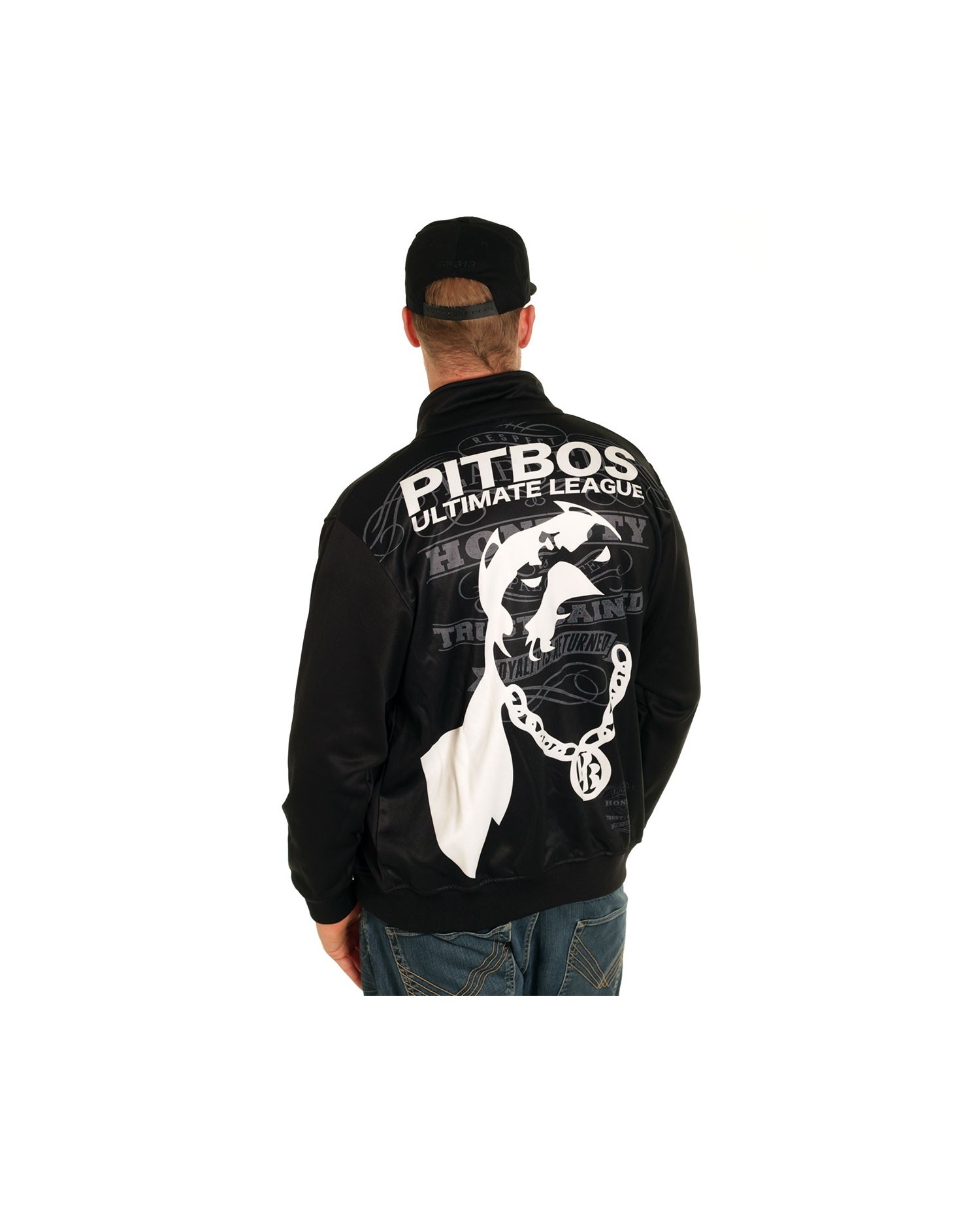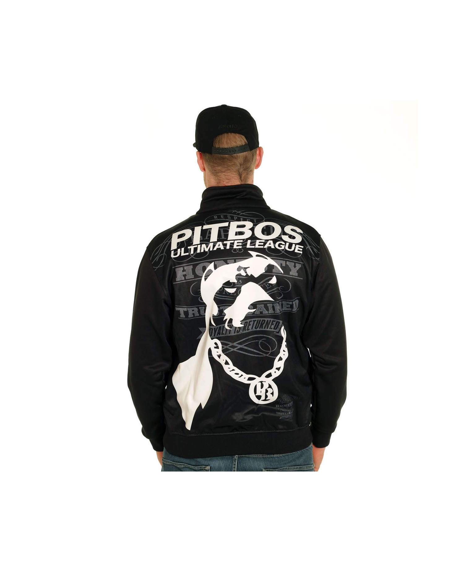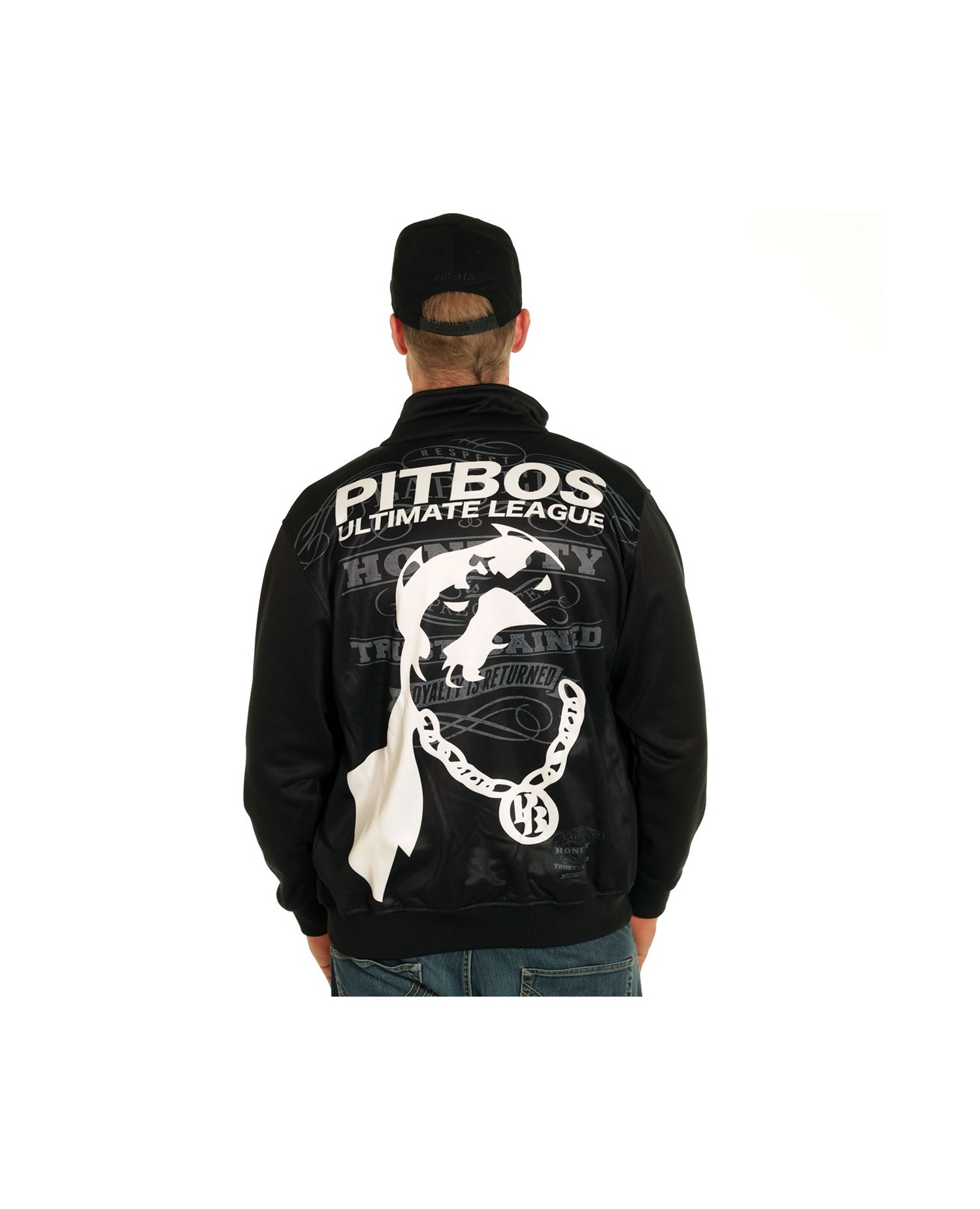#WhoLetTheDogsOut?! Pitbos5.515 er navnet. Så kom den vilde sort/hvide Ultimate League Trackjacket. Den coole robuste Pitbos hund indtager hele ryggen med sin blærede PB kædehalskæde. Den hvide hund ruler oven på et stærkt statement, som er skrevet med grå håndkoloreret skrift: Udsagnet lyder: "Respect is earned, Honesty is appreciated, Trust is gained, Loyalty is returned." På brystet er placeret et mindre larmende brandlogo print. Jakken har to praktiske lommer og er lavet i behageligt blødt polyester.