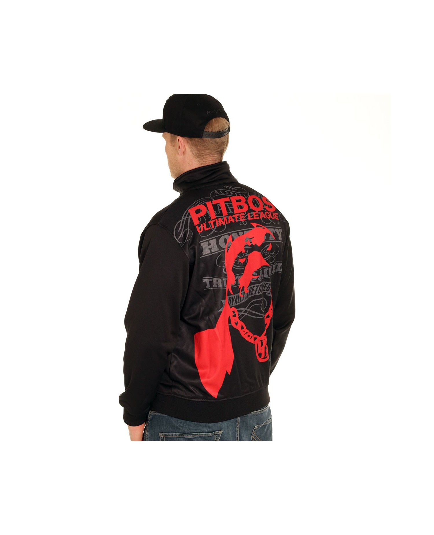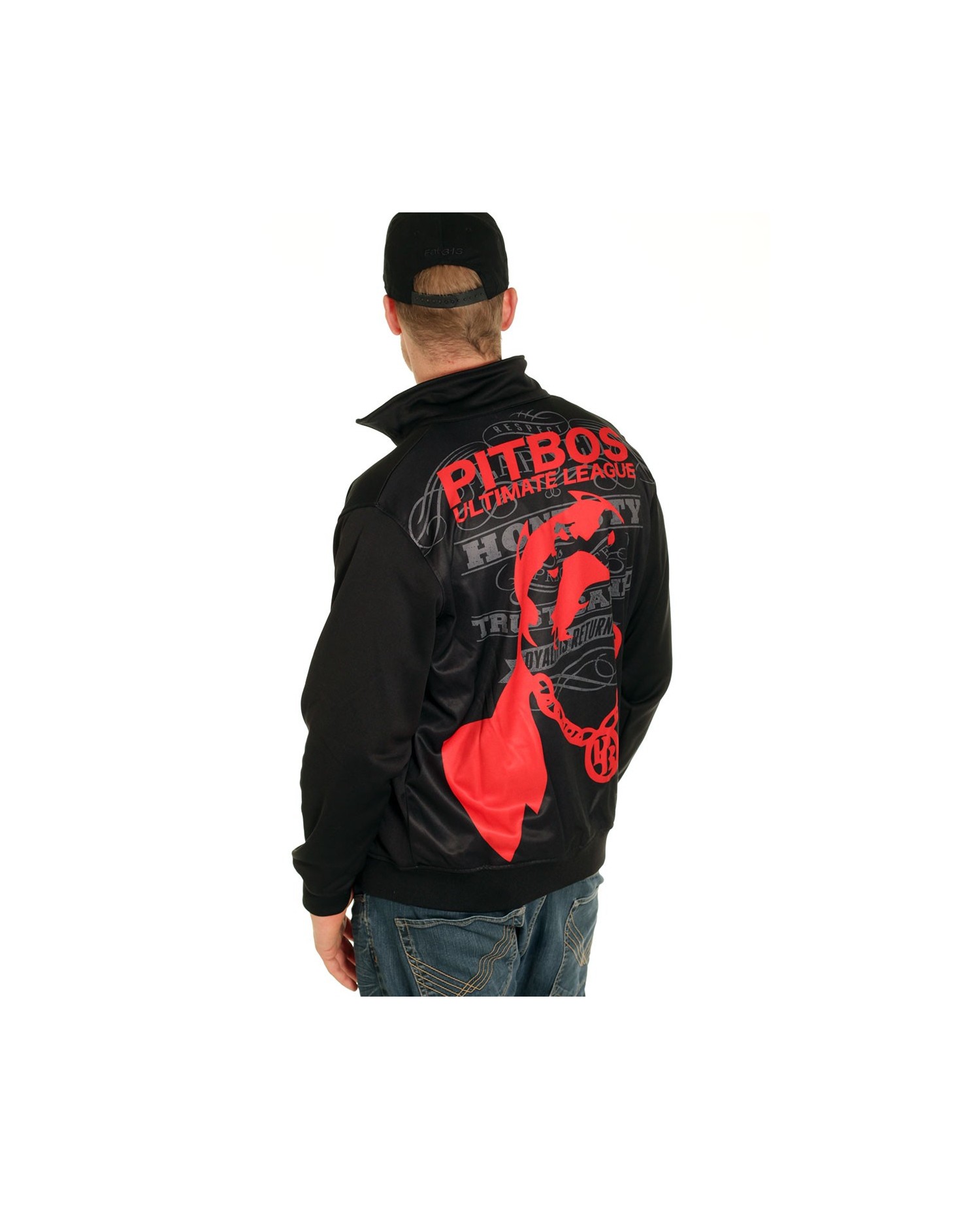 #WhoLetTheDogsOut?! Pitbos5.515 er navnet. Så kom den vilde sort/røde Ultimate League Trackjacket. Den coole robuste Pitbos hund indtager hele ryggen med sin blærede PB kædehalskæde. Den røde hund ruler oven på et stærkt statement, som er skrevet med grå håndkoloreret skrift: Udsagnet lyder: "Respect is earned, Honesty is appreciated, Trust is gained, Loyalty is returned." På brystet er placeret et mindre larmende brandlogo print. Jakken har to praktiske lommer og er lavet i behageligt blødt polyester.