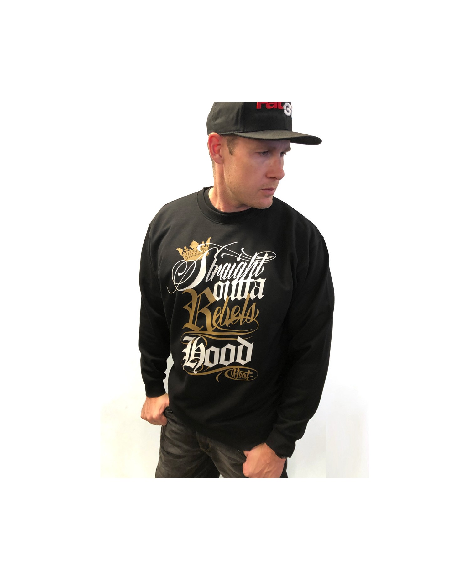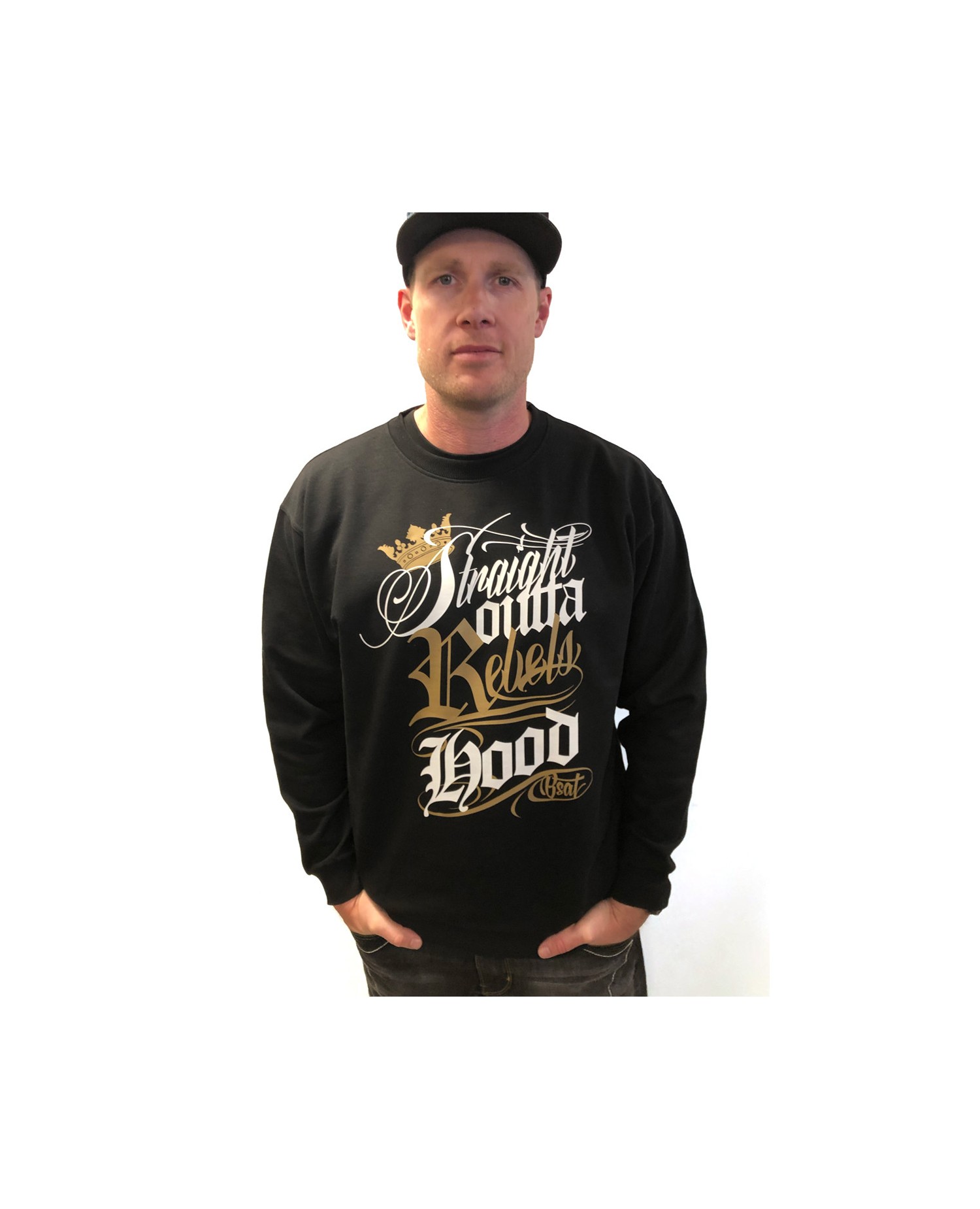 Straight Outta Rebels Hood' fra BSAT Clothing spiller på det legendariske 'Straight Outta Compton' , men nu gælder det rebeller overalt i verden. "Rebels Hood" er her og der og allevegne. Det rammer! Og designet er smukt! skrevet med kunstnerisk skrift i hvidt og royalt guld. Printet troner på hele forsiden. I nakken et guld brandlogo print med kongekrone. RudeCru er nede med det: BSAT er et stærkt og råt Clothingbrand med rødderne dybt forankret i HipHopkulturen.
