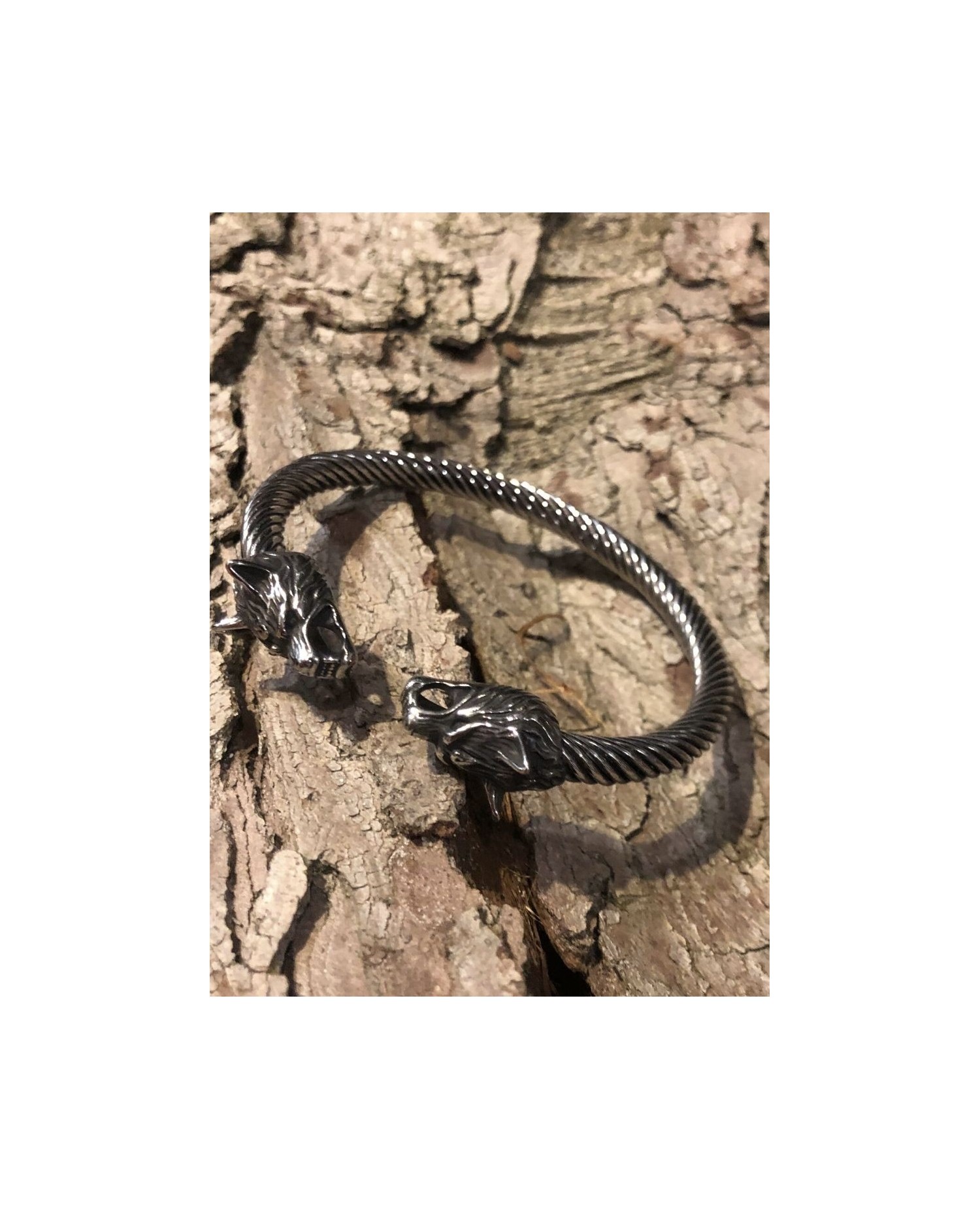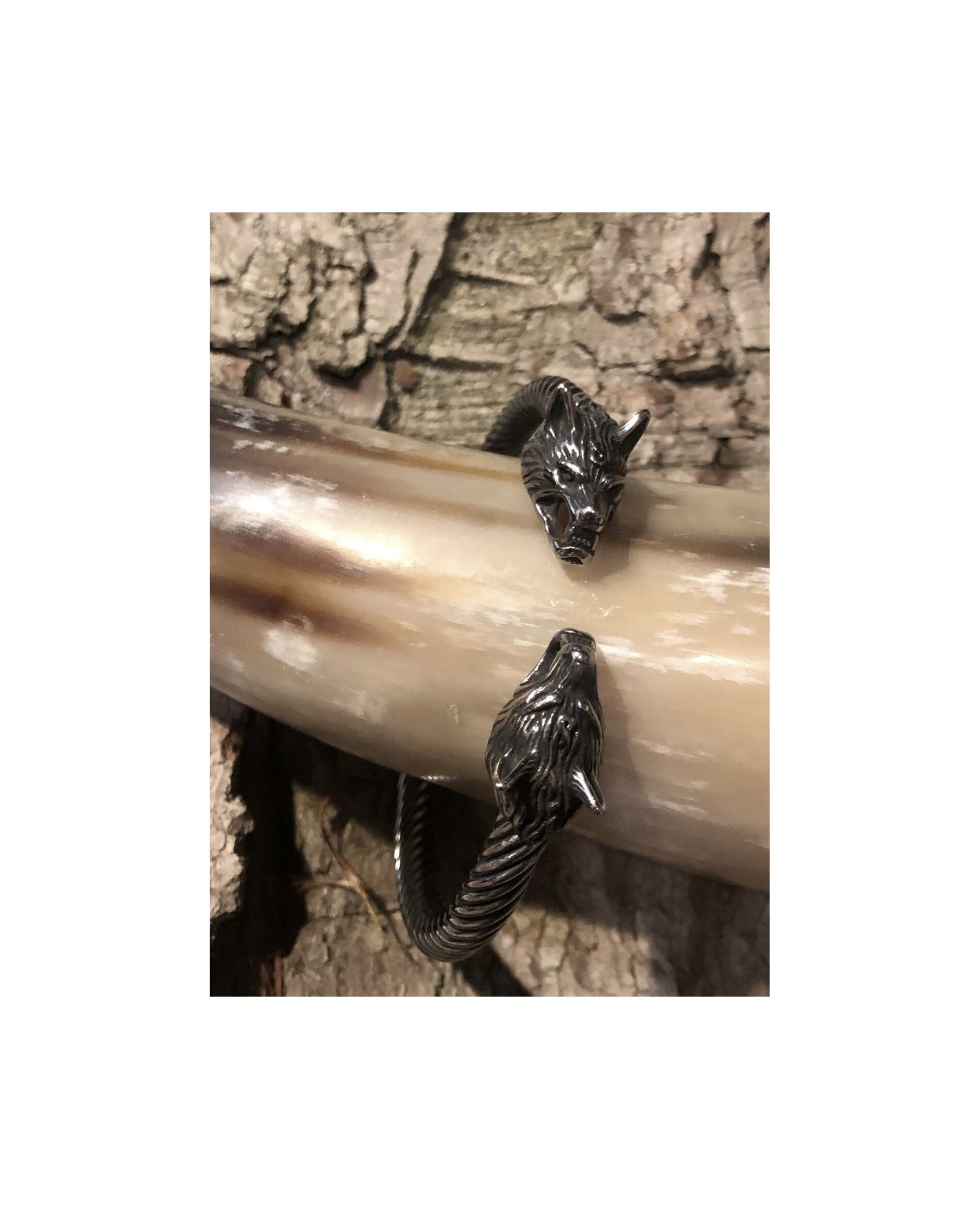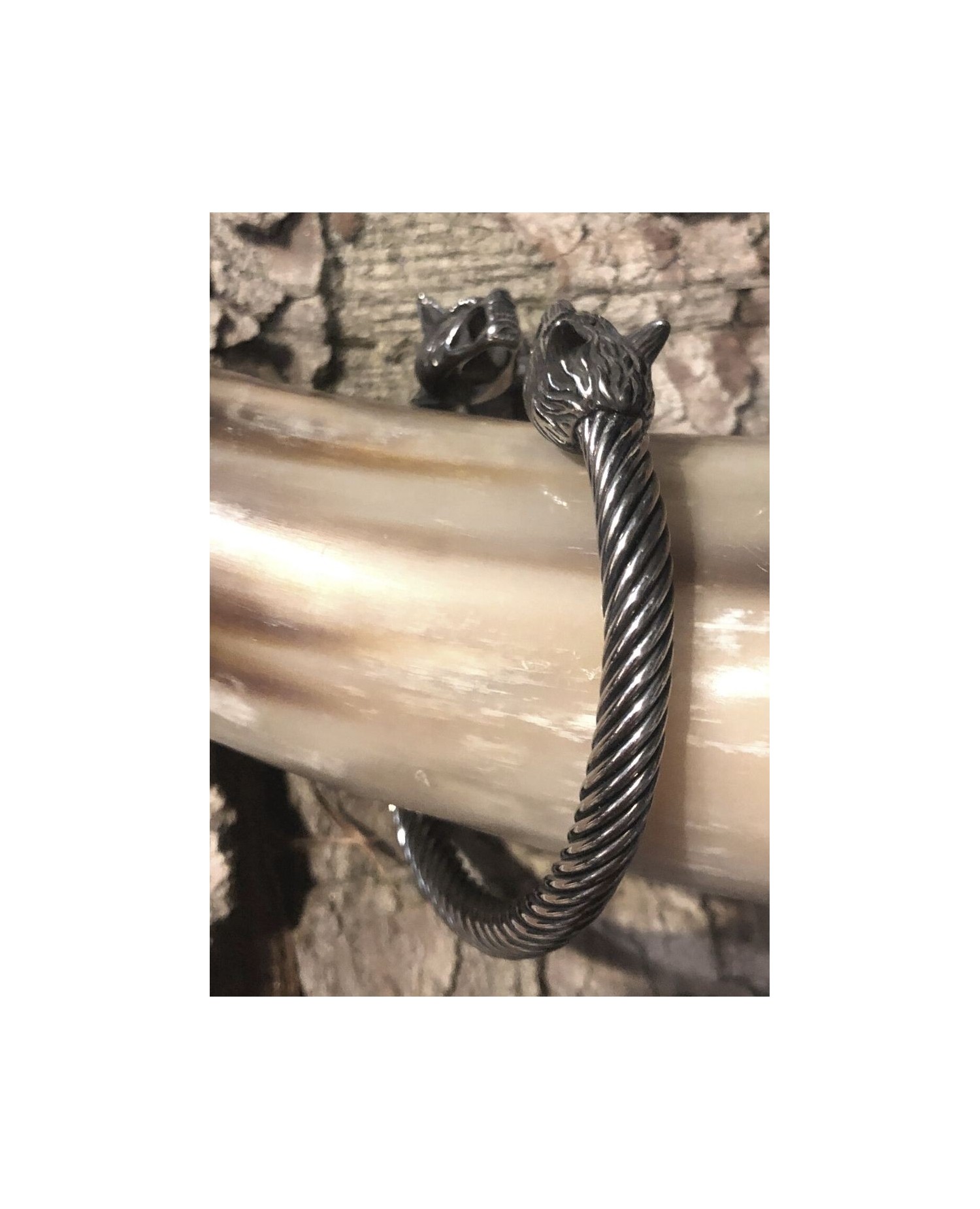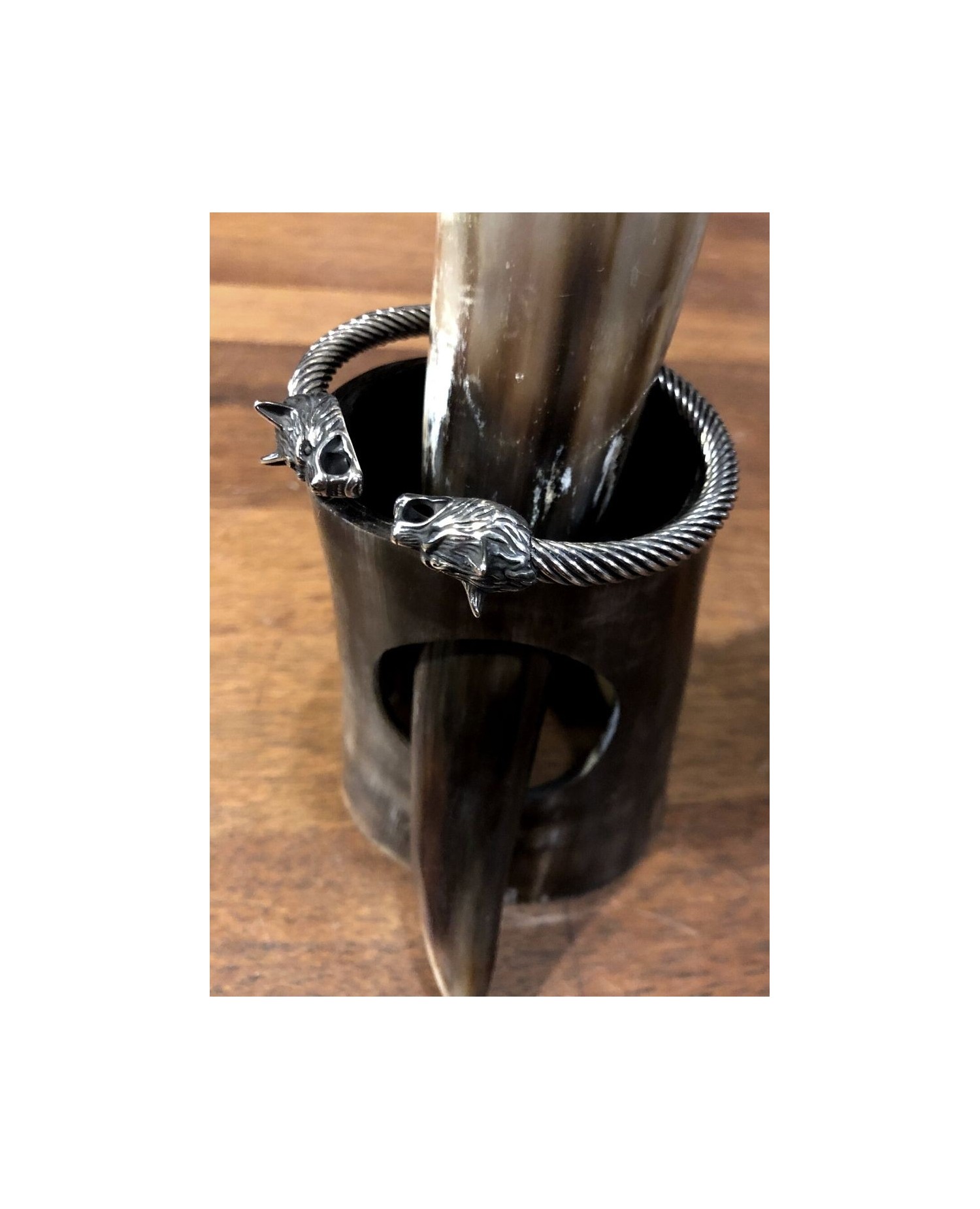 Armringen i snoet rustfrit stål munder ud i Odins Ulve Freki og Geri. Indvendig størrelse på ringen: 6 cm. Armringen er et smykke til håndleddet, ikke egnet til overarmen.