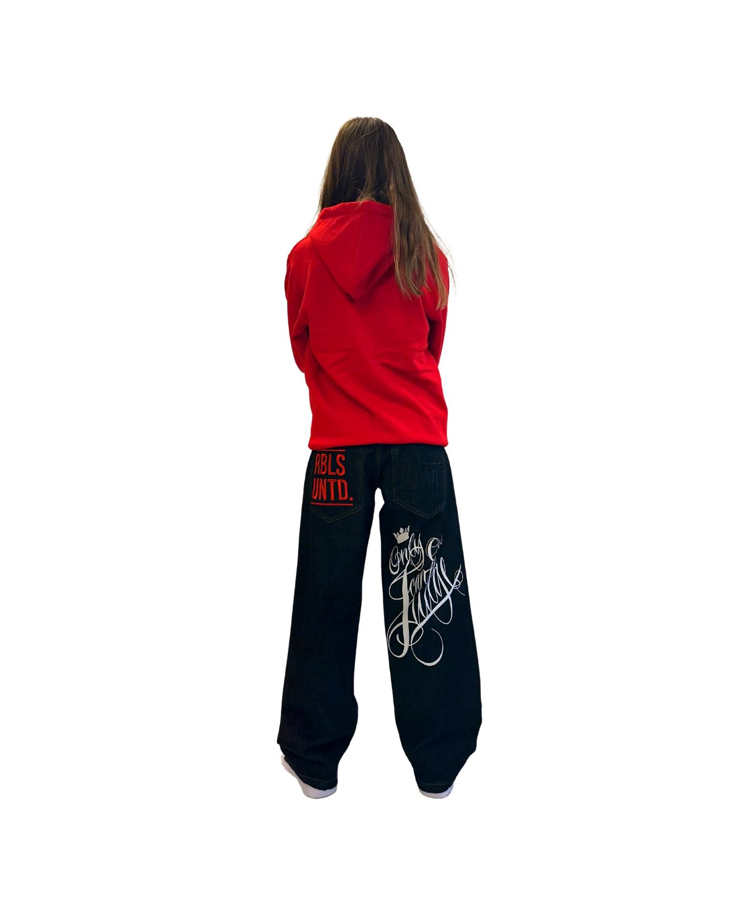 "Only God can judge" Artworket rocker bag på højre bukseben i hvidt. Venstre baglomme er smukt og iøjnefaldende broderet med en forkortning af Rebels United. Med rød tråd står der RBLS UNTD. På højre baglomme er broderet et sort tone in tone brand logo. Foran er Jeans'ene brandet med et lille broderet krone logo på højre møntlomme i en matchende rød farve.