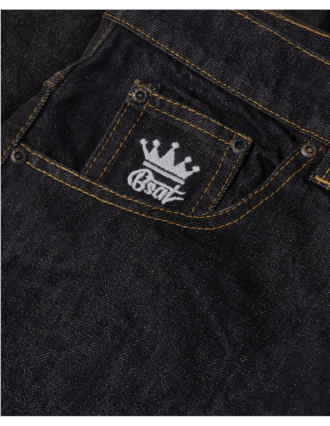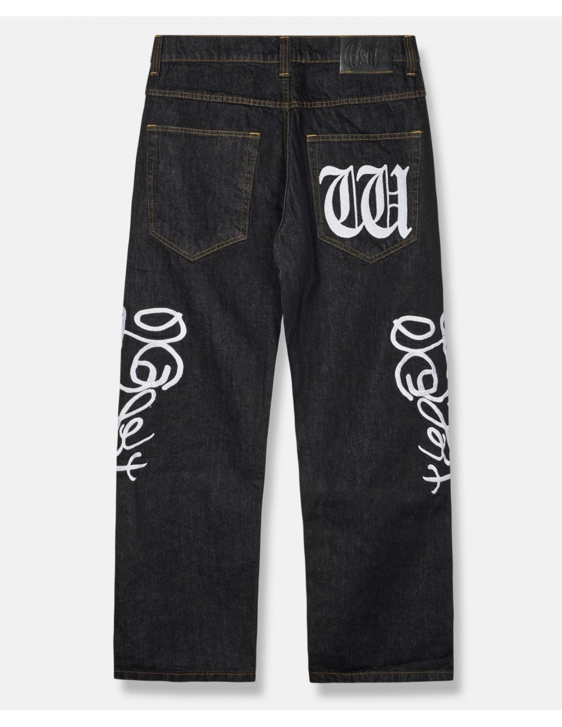 Westside står skrevet på buksebenene, mens et enkelt W er broderet på venstre baglomme.