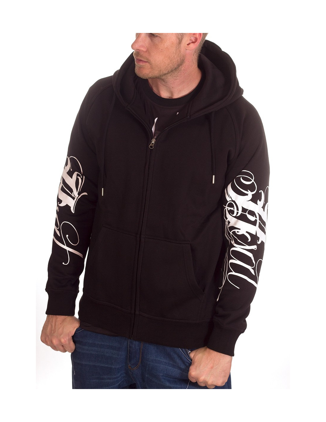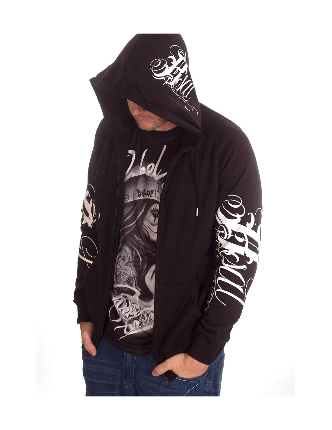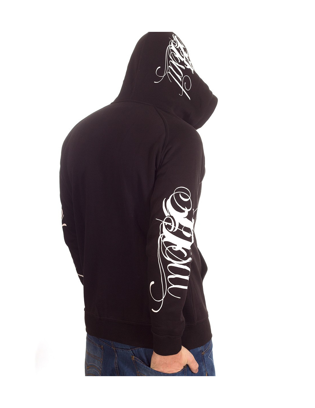 Stilfuld, lækker og komfortabel Fashion Hoodie fra BSAT. Hoodien er sort med brandets smukke Art Script logo på hætten og ned af begge ærmer. BSAT er RudeCru's RebelFashion brand, inspireret af StreetArt, TattooArt, La Onda og musikscenen.