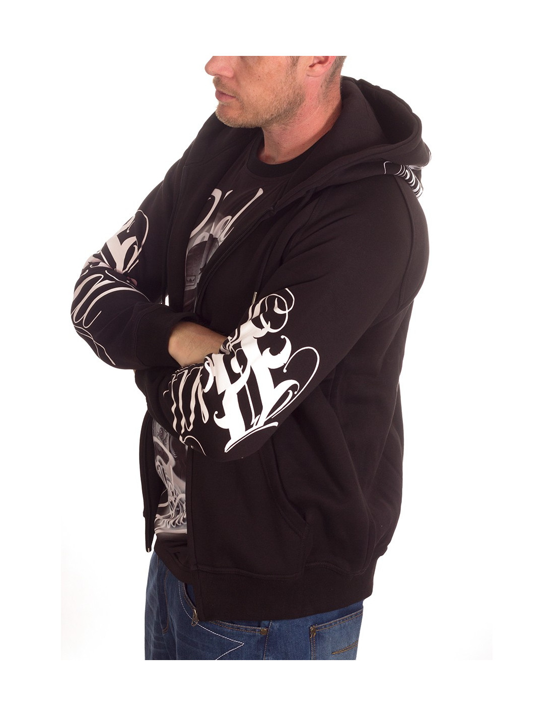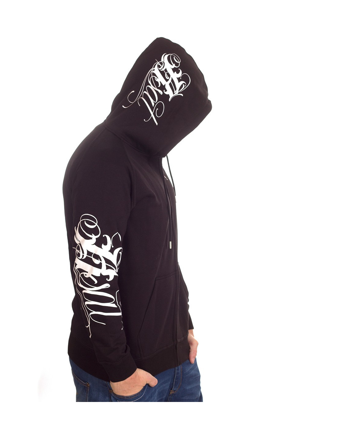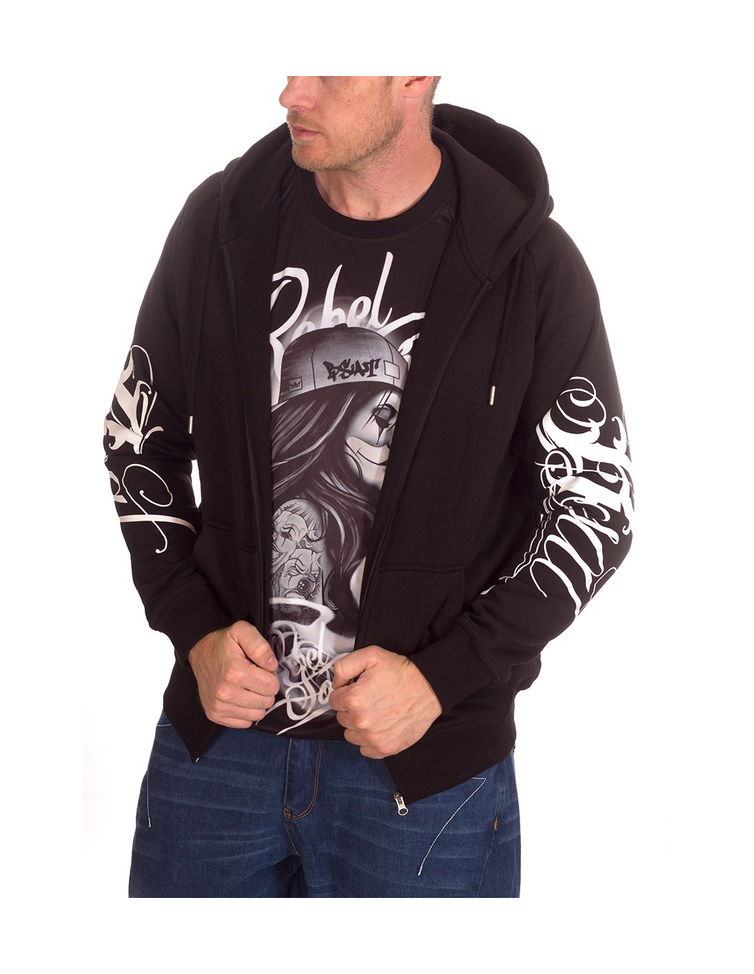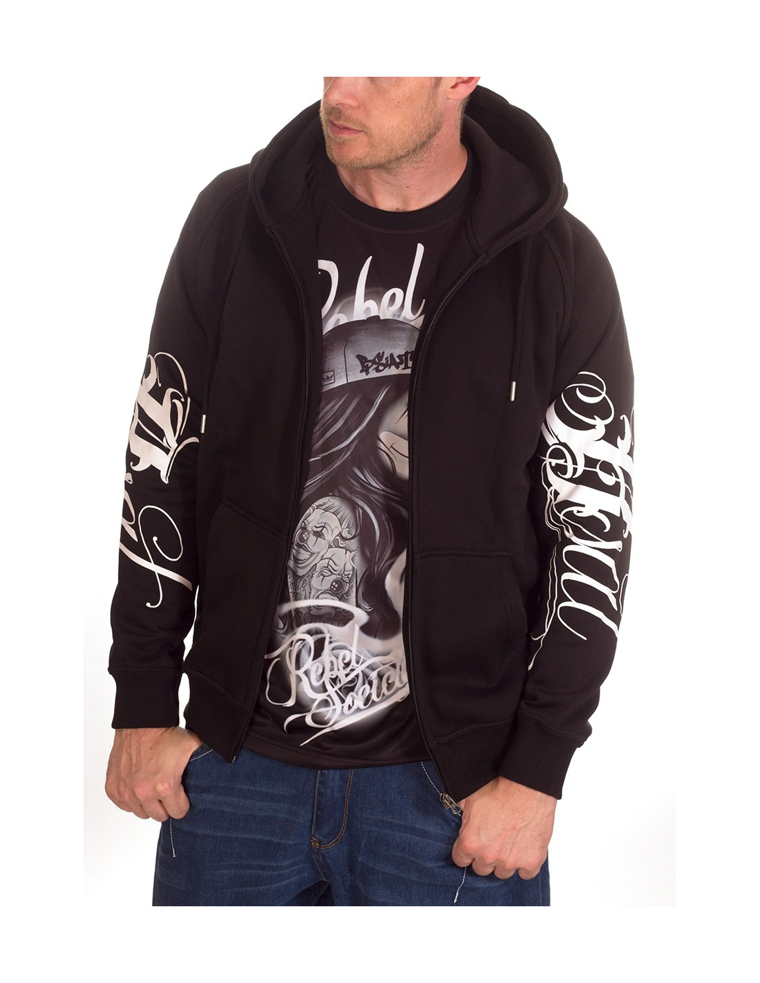 Stilfuld, lækker og komfortabel Fashion Hoodie fra BSAT. Hoodien er sort med brandets smukke Art Script logo på hætten og ned af begge ærmer. BSAT er RudeCru's RebelFashion brand, inspireret af StreetArt, TattooArt, La Onda og musikscenen.
