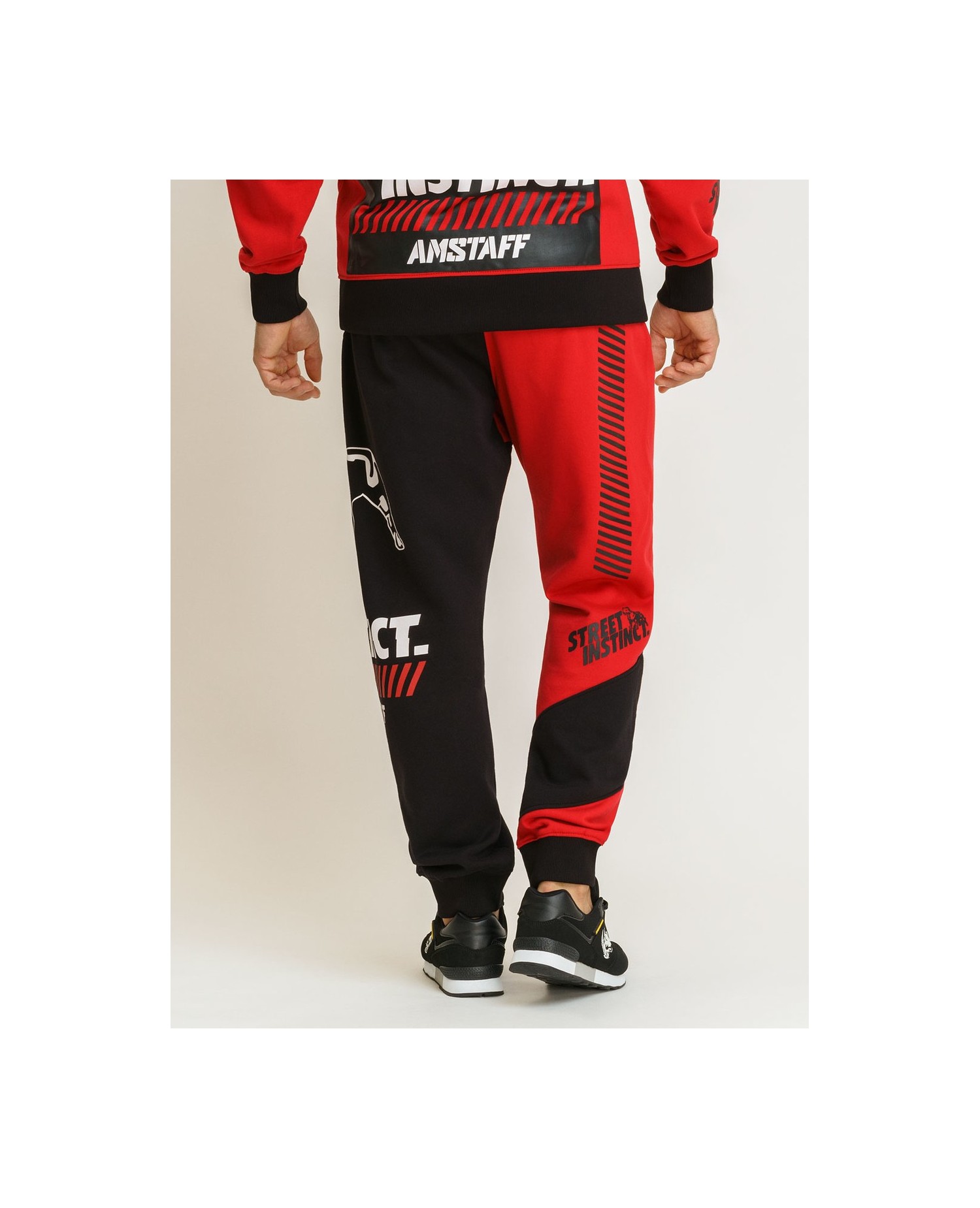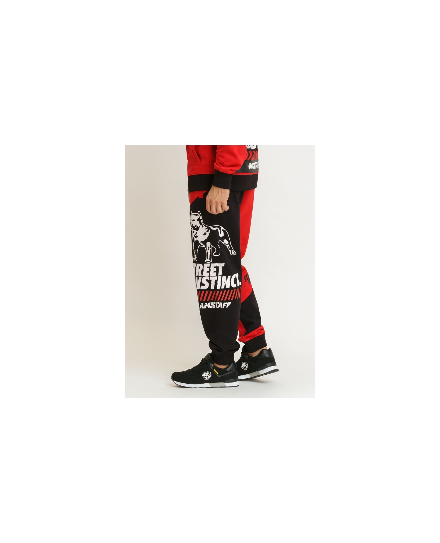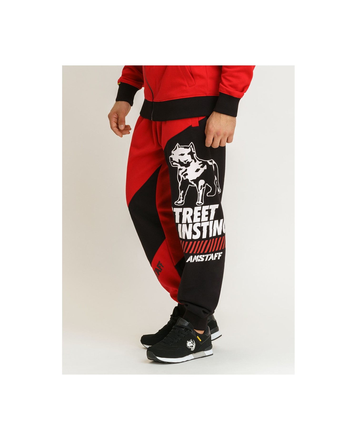 Coole, sporty Sweatpants i RudeCru Dogzdepartement fra Amstaff Wear. Street Instinct bukserne er røde og sorte med seje, iøjnefaldende detaljer og brandlogo hunden. Buksen er forsynet med en praktisk lynlås baglomme. Materiale: 80% bomuld og 20% polyester.