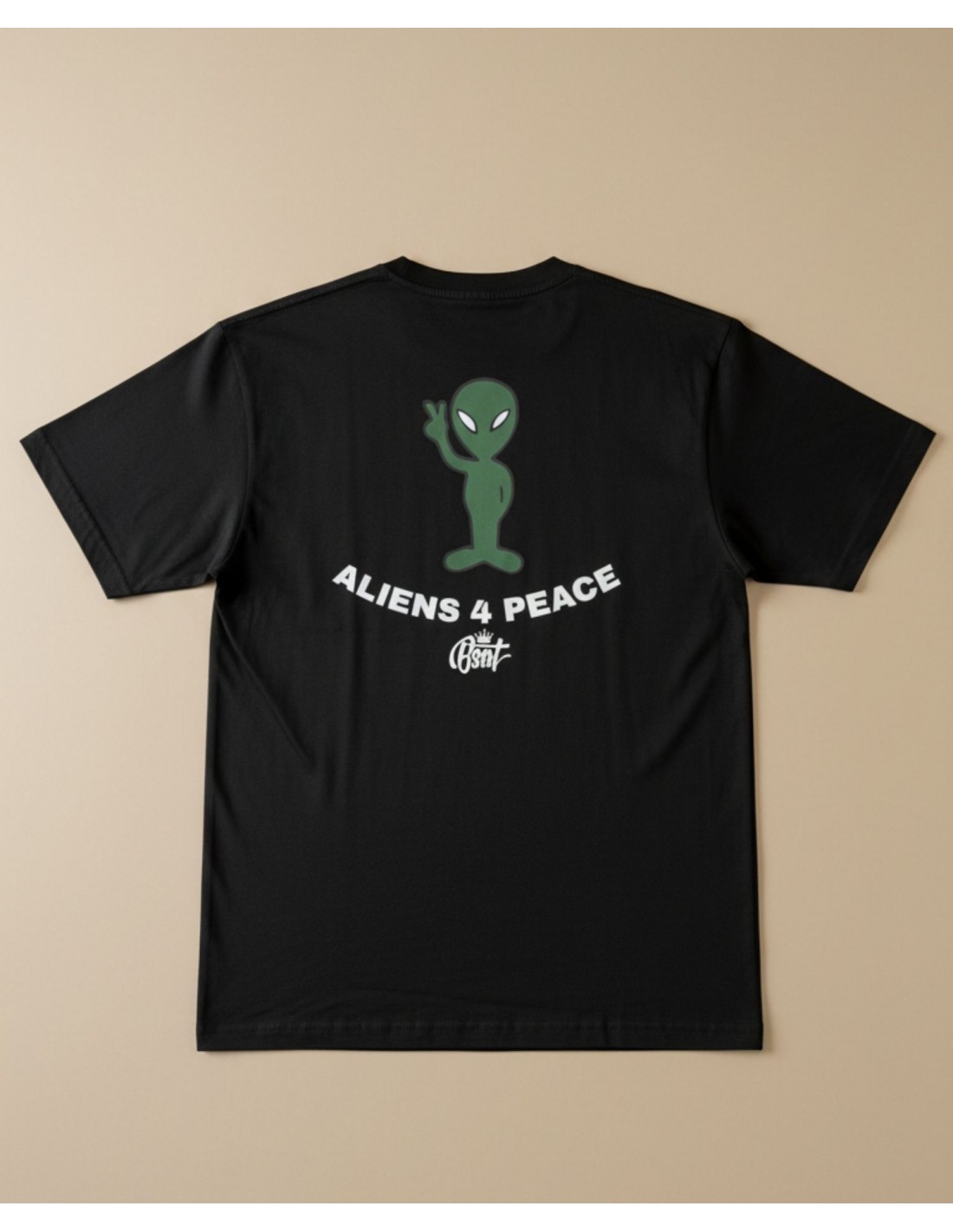 Fronten prydes af det ikoniske BSAT-logo, mens bagsiden har et stærkt grafisk print med “Aliens 4 Peace” og en alien, der sender et fredstegn – et statement piece for dig, der tør skille dig ud.