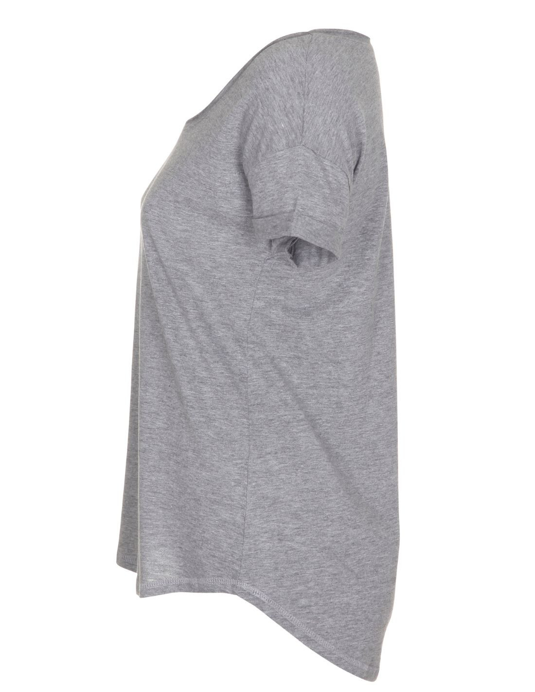 Loose feminin T-Shirt i grå med en buet bund. Den runder op i siderne og er en smule længere bag på end foran. Ærmerne har et elegant opsmøg på 2,5 cm, som er hæftet i midten af ærmet. Halskanten er skåret op, som giver kant til T-Shirtens feminine look. Alle Str. er produceret i økologisk bomuld på nær str.2XL.