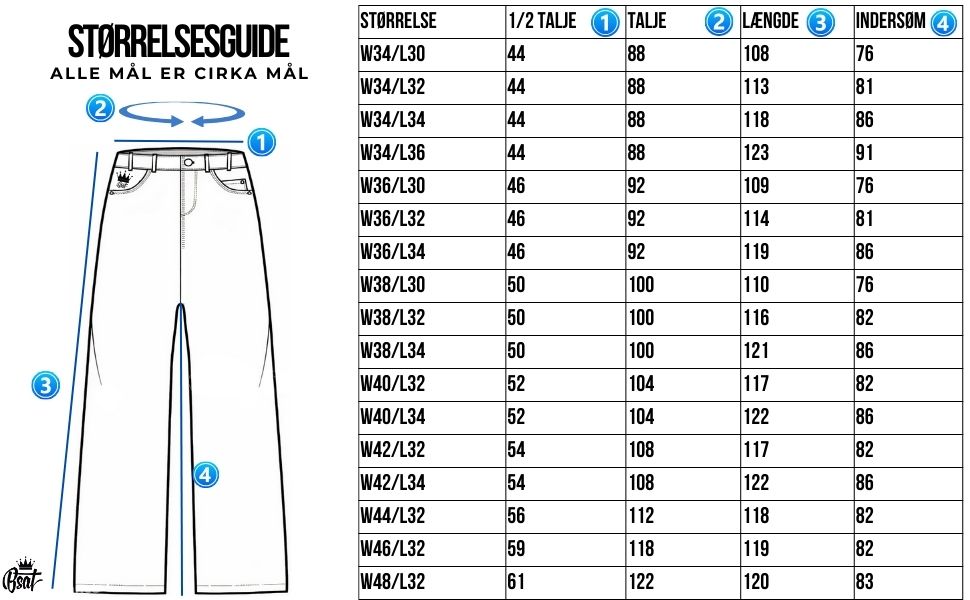 I vores udvalg af baggy jeans finder du fashion baggy jeans, som er udsmykket med forskellige designs, samt plain baggy jeans. Alle vores jeans er unisex og kan derfor bruges af både mænd og kvinder. Find din rigtige størrelse ved hjælp af størrelsesguiden ovenfor.