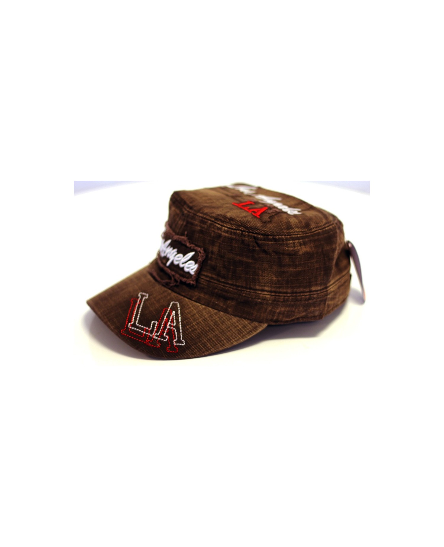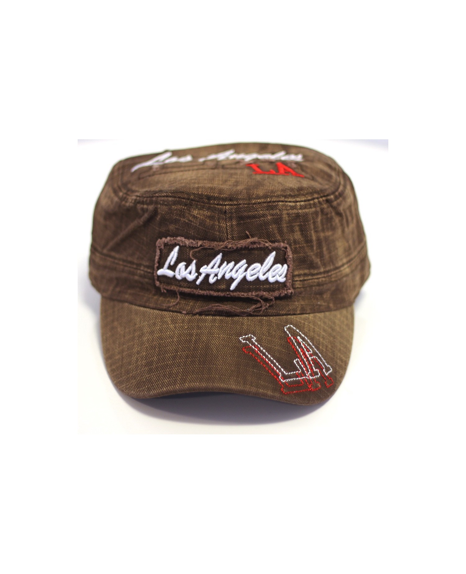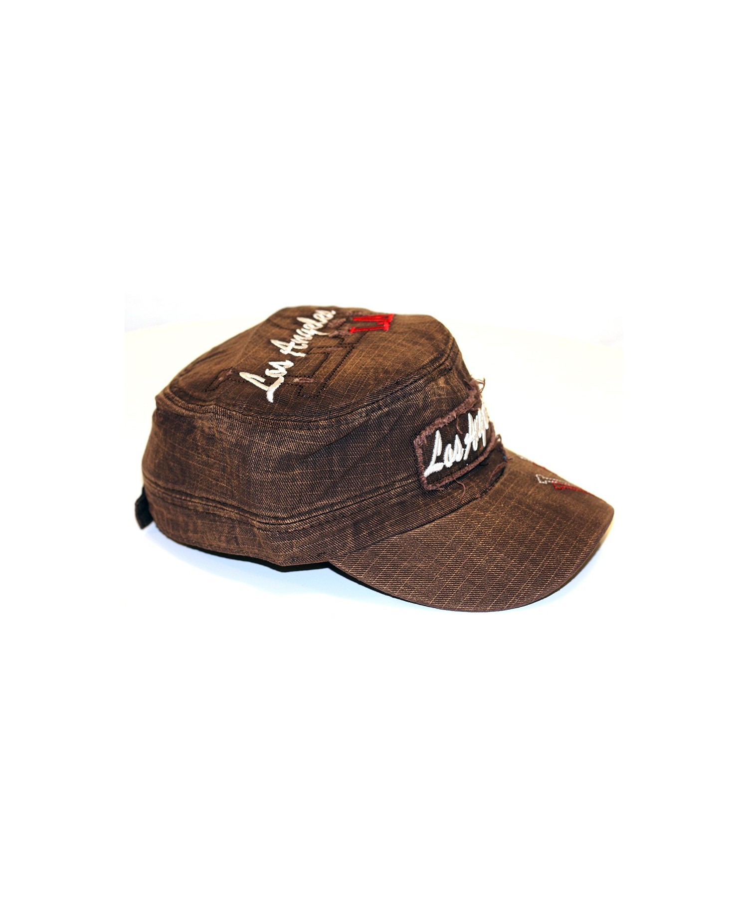 Svedig Fashion Cap fra det amerikanske Identity i vintage denim stil. Cappen er brun, draperet med hvid og rød syning. One-Size med justerbar lukning bagpå.