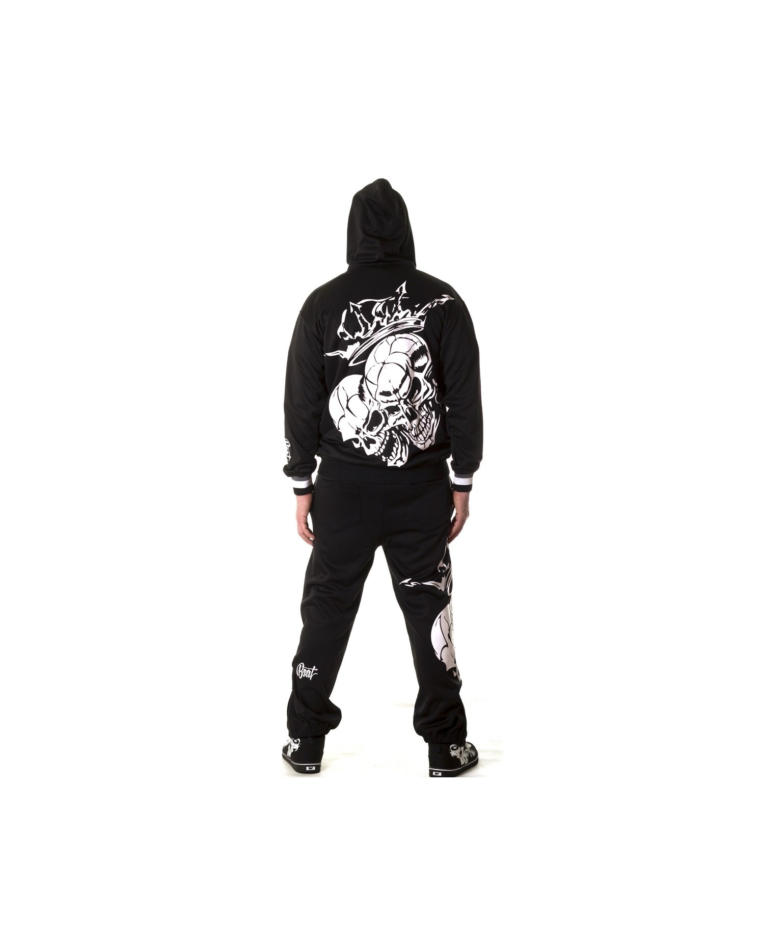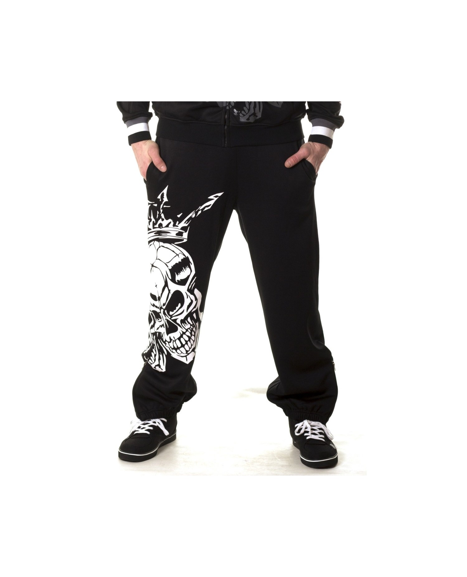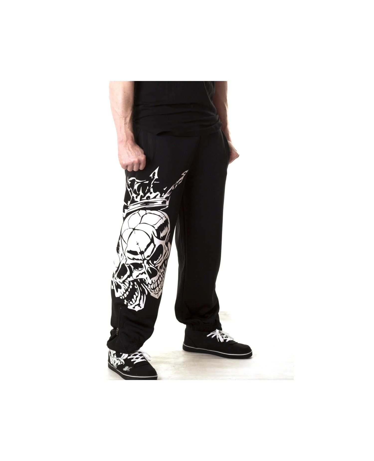 Sweatpantsene har to imponerende hvide royale skulls på højre ben. Bag på venstre ben er vævet et hvidt BSAT logo. BSAT er et hip-hop og Urban Art streetwear mærke, som især er slået igennem med originale skull produkter og usædvanige chica designs.Sweatpantsene er sorte, har sidelommer og baglommer med velcro lukning. Bukserne har lynlås ved anklerne og et indvendigt sort snøretræk til at sikre den bedste pasform. BSAT er et hip-hop og Urban Art streetwear mærke, som især er slået igennem med originale skull produkter og usædvanige chica designs.