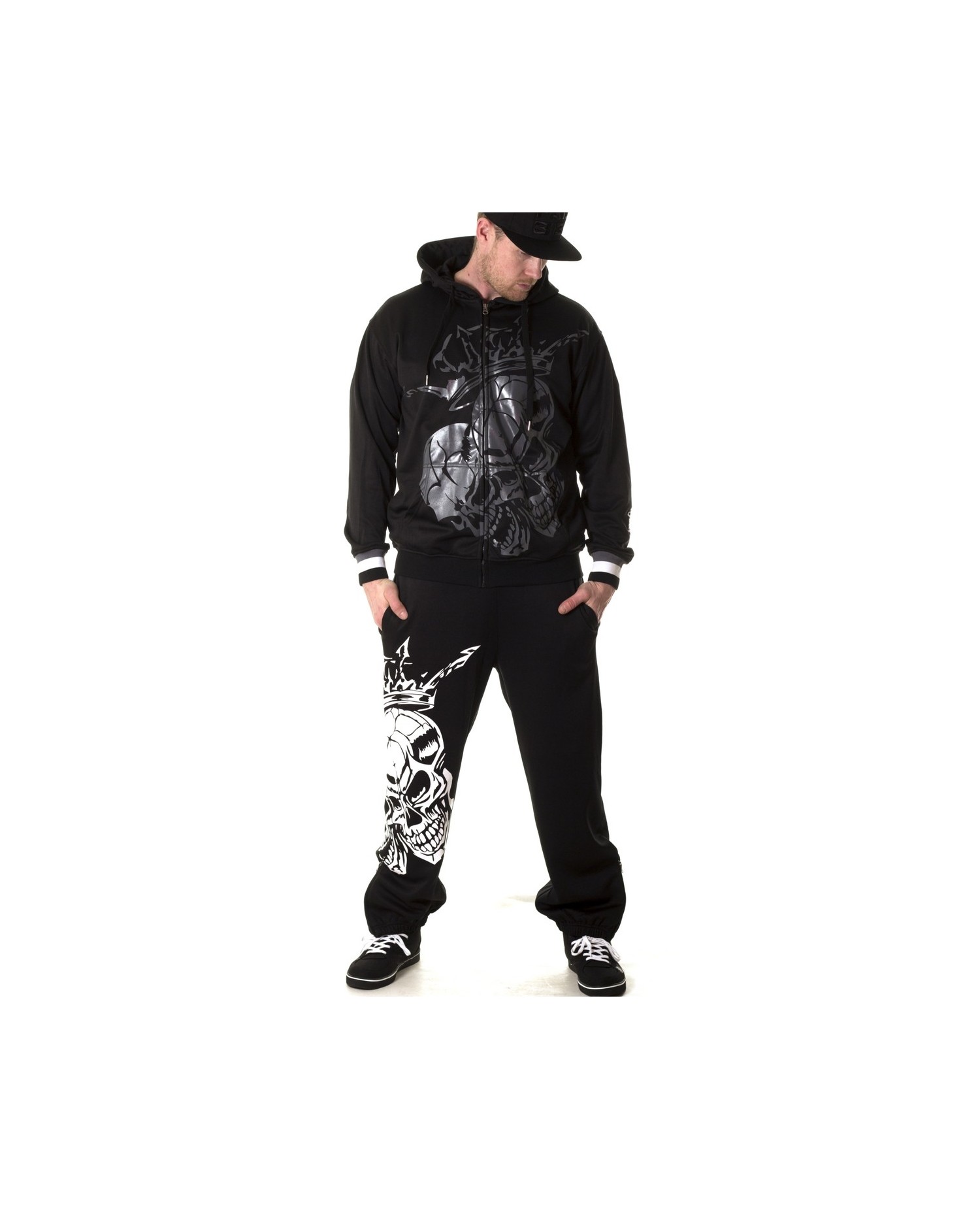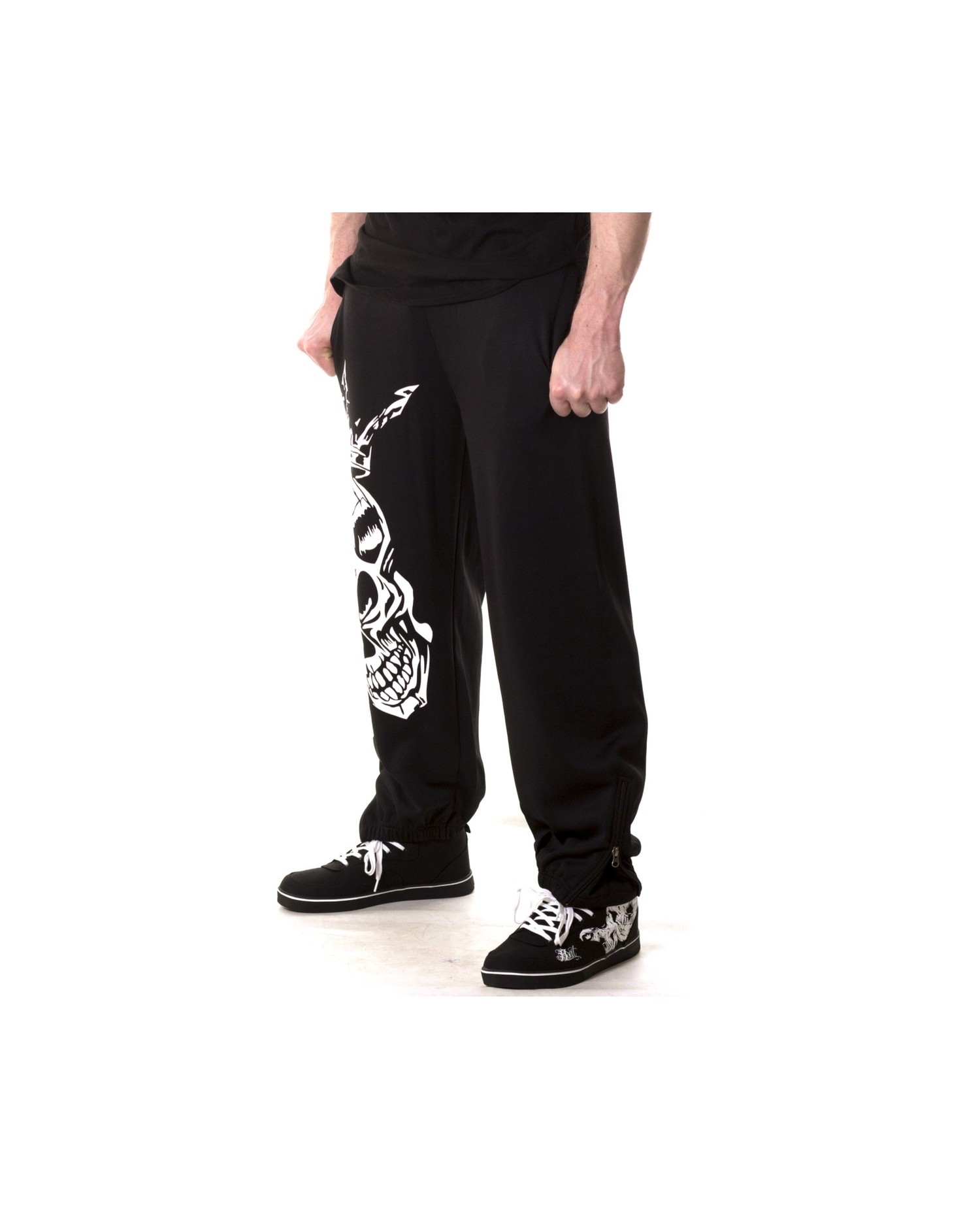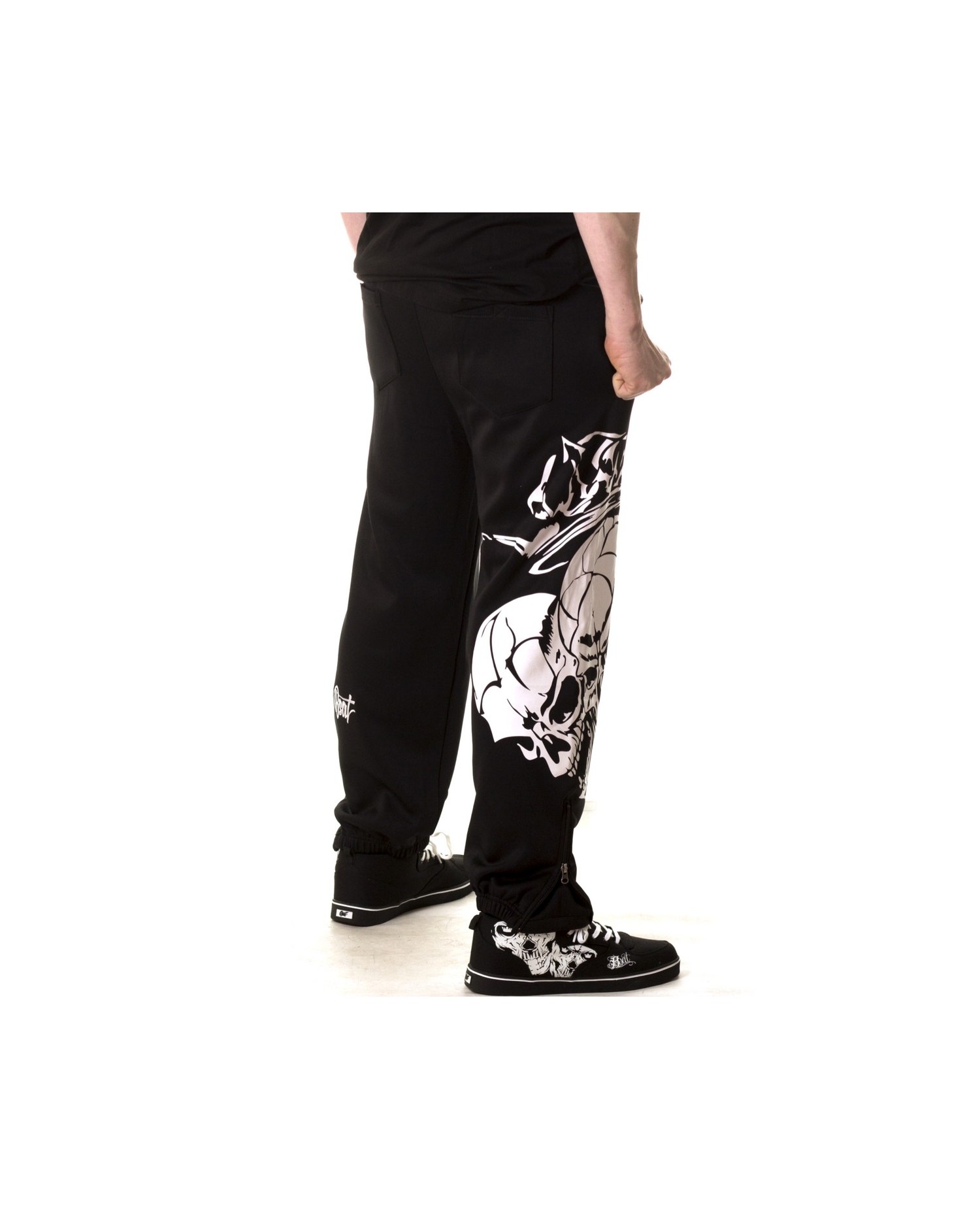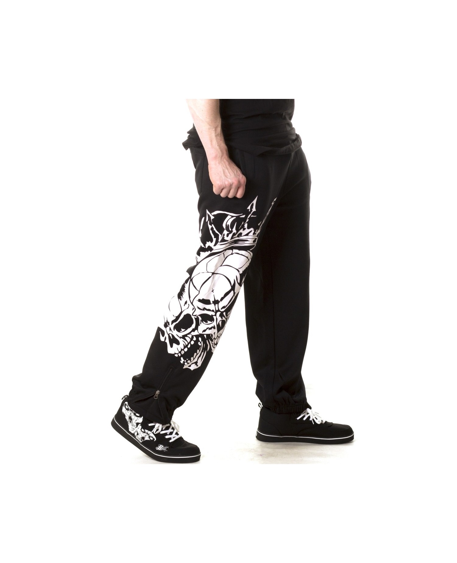 Sweatpantsene har to imponerende hvide royale skulls på højre ben. Bag på venstre ben er vævet et hvidt BSAT logo. BSAT er et hip-hop og Urban Art streetwear mærke, som især er slået igennem med originale skull produkter og usædvanige chica designs.Sweatpantsene er sorte, har sidelommer og baglommer med velcro lukning. Bukserne har lynlås ved anklerne og et indvendigt sort snøretræk til at sikre den bedste pasform. BSAT er et hip-hop og Urban Art streetwear mærke, som især er slået igennem med originale skull produkter og usædvanige chica designs.