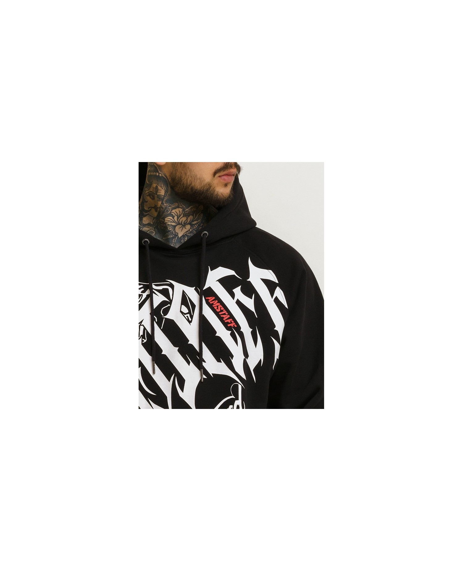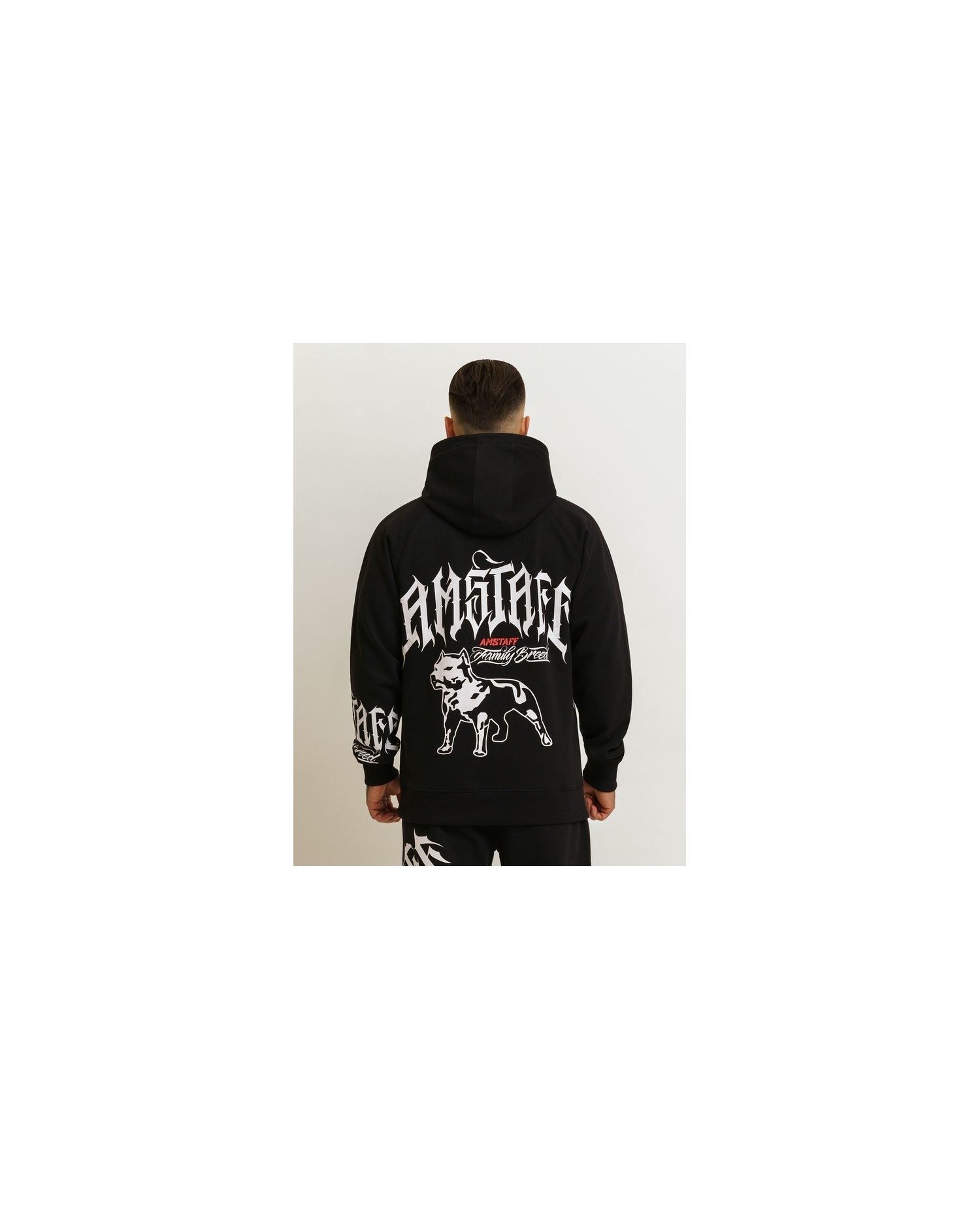 Vild Family Breed Hoodie fra Amstaff. Logonavnet er skrevet med nærmest flammende kunstnerisk skrift og sammen med den vågne logo hund pynter de både på Hoodiens for- og bagside. Hoodien har sidelommer og er produceret i 80% bomuld og 20% polyester.