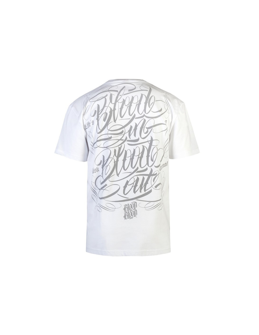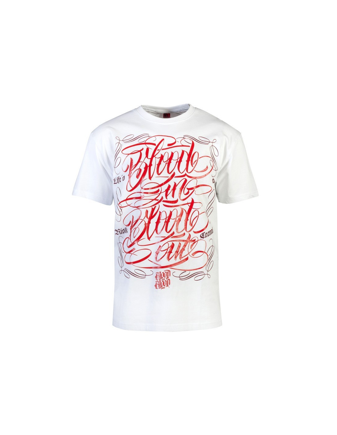 Hvid bomulds T-Shirt fra Rebelbrandet Blood In Blood Out med stort brandlogo. Printet på forsiden er rødt og gråt på bagsiden. God pasform og komfort.