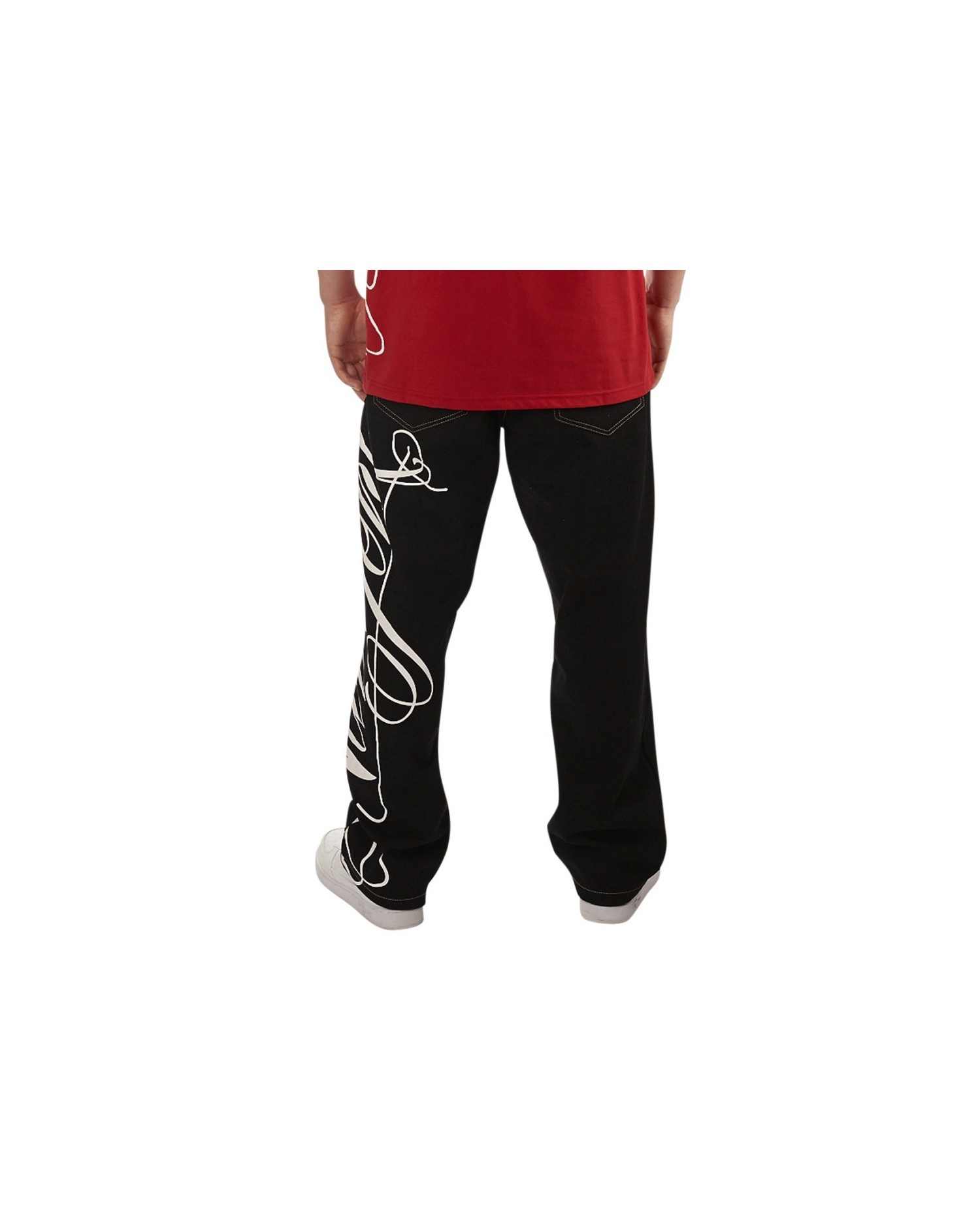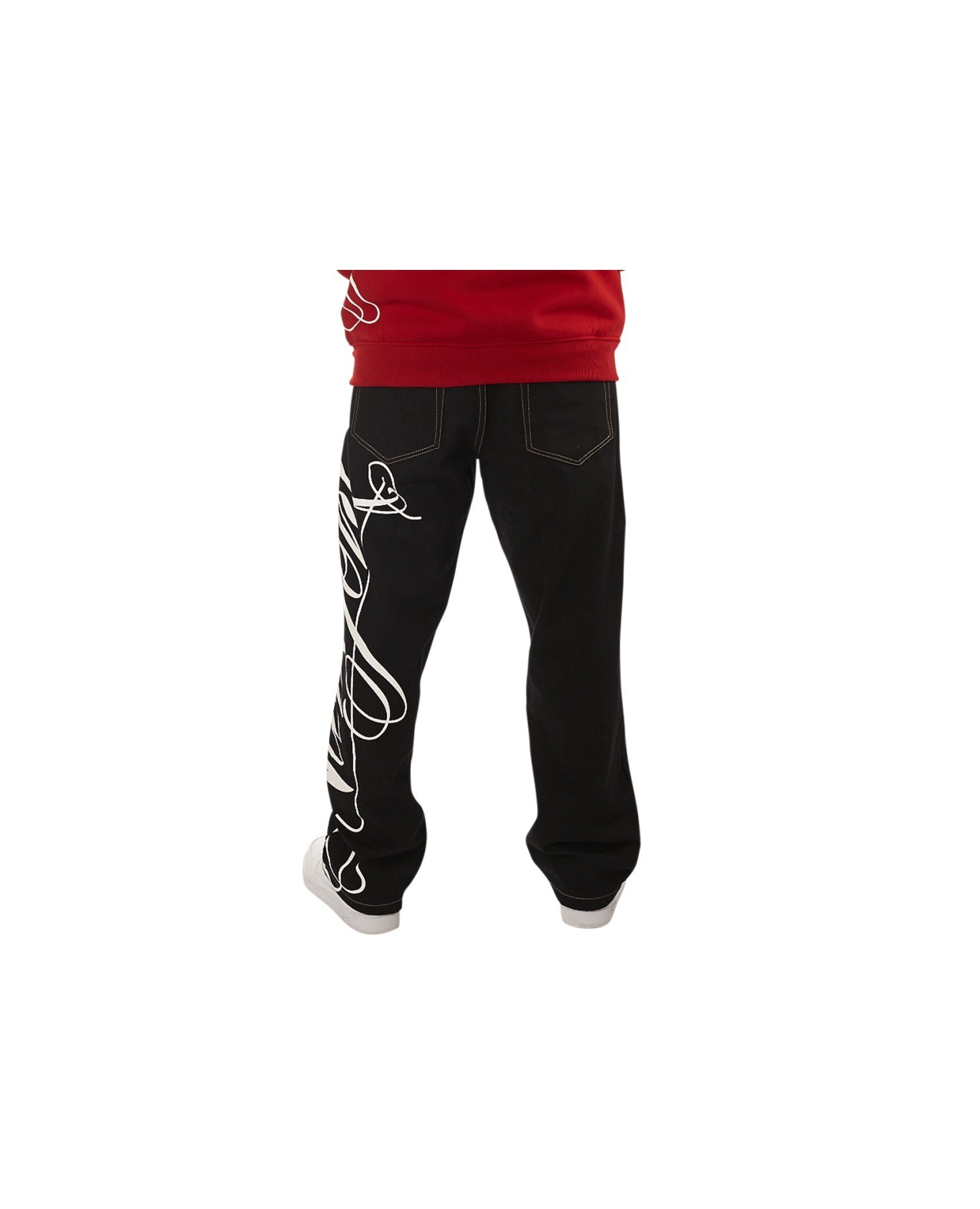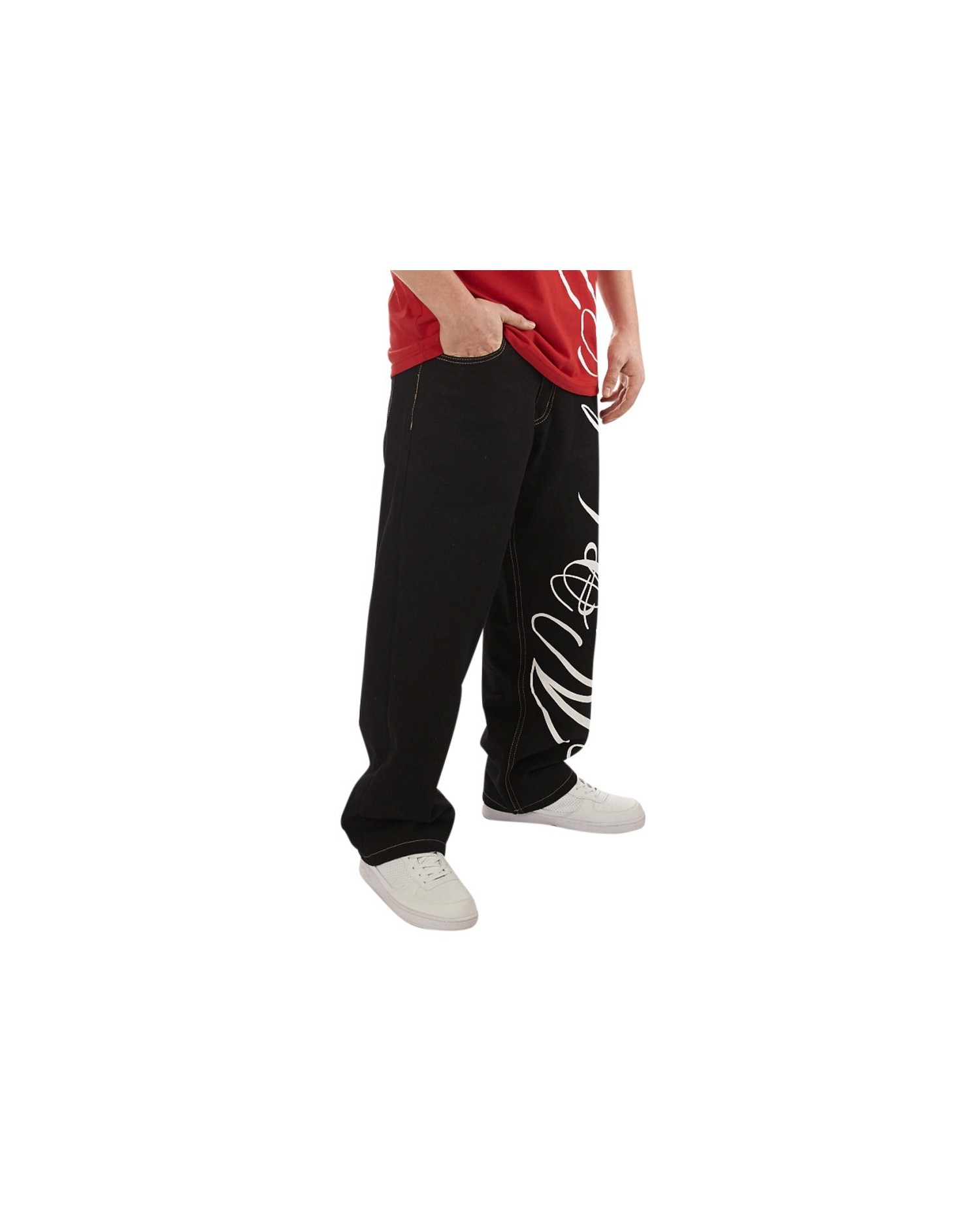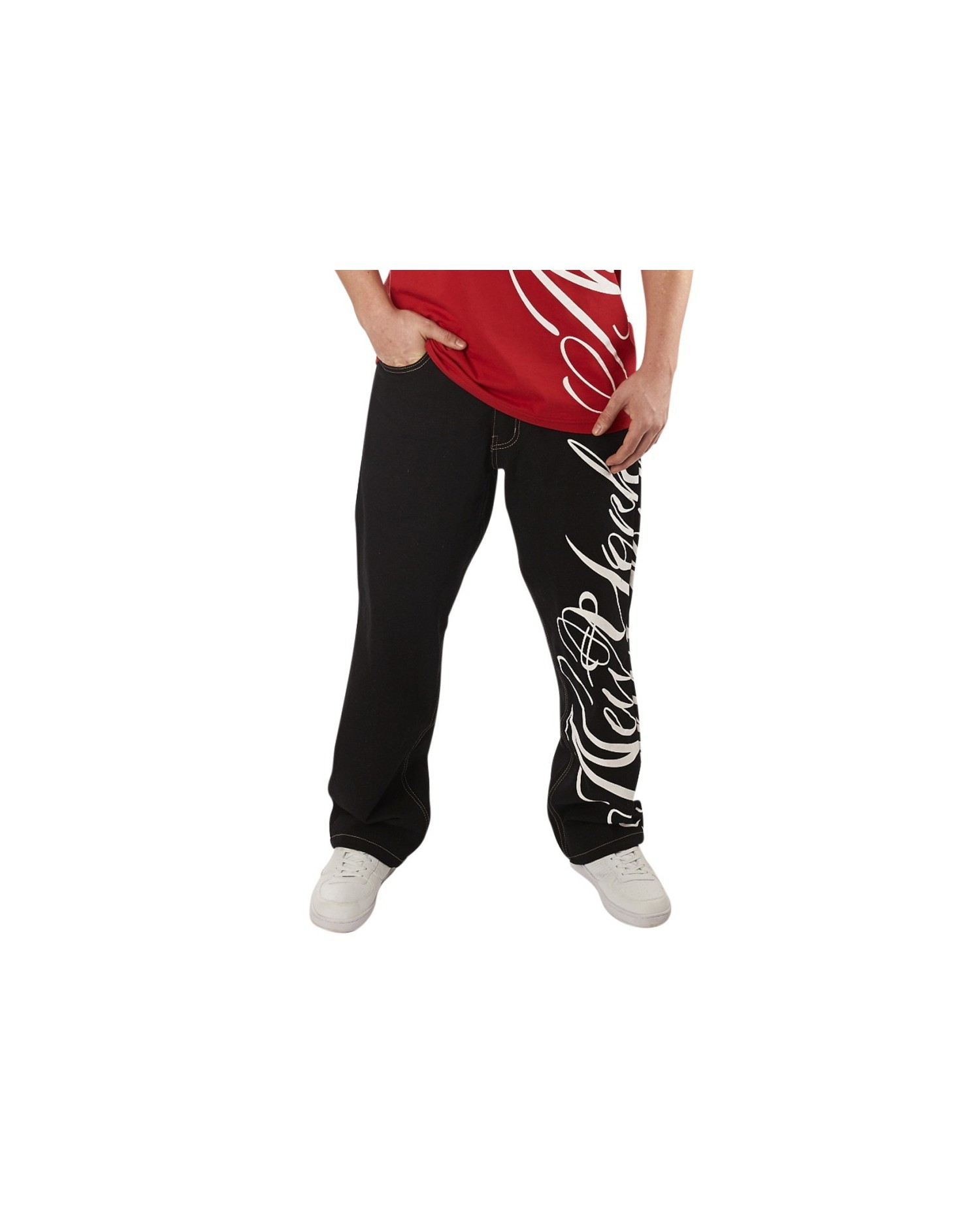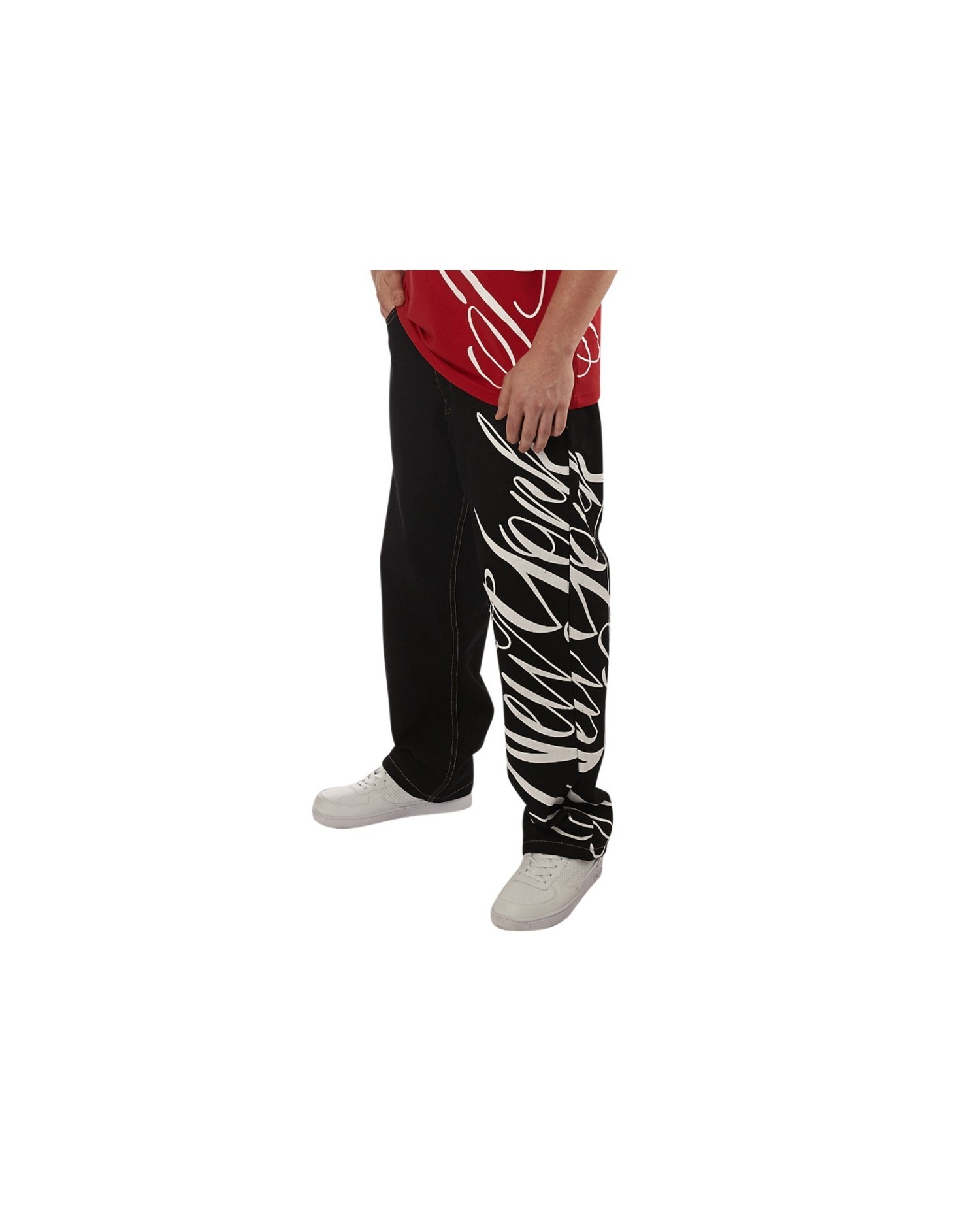 Hyvännäköiset mustat denim baggy farkut itsolla New York Printillä. Yhdistä farkut yhteensopivalla t-paidalla tai hupparilla ja luo yhteinäinen setti.
