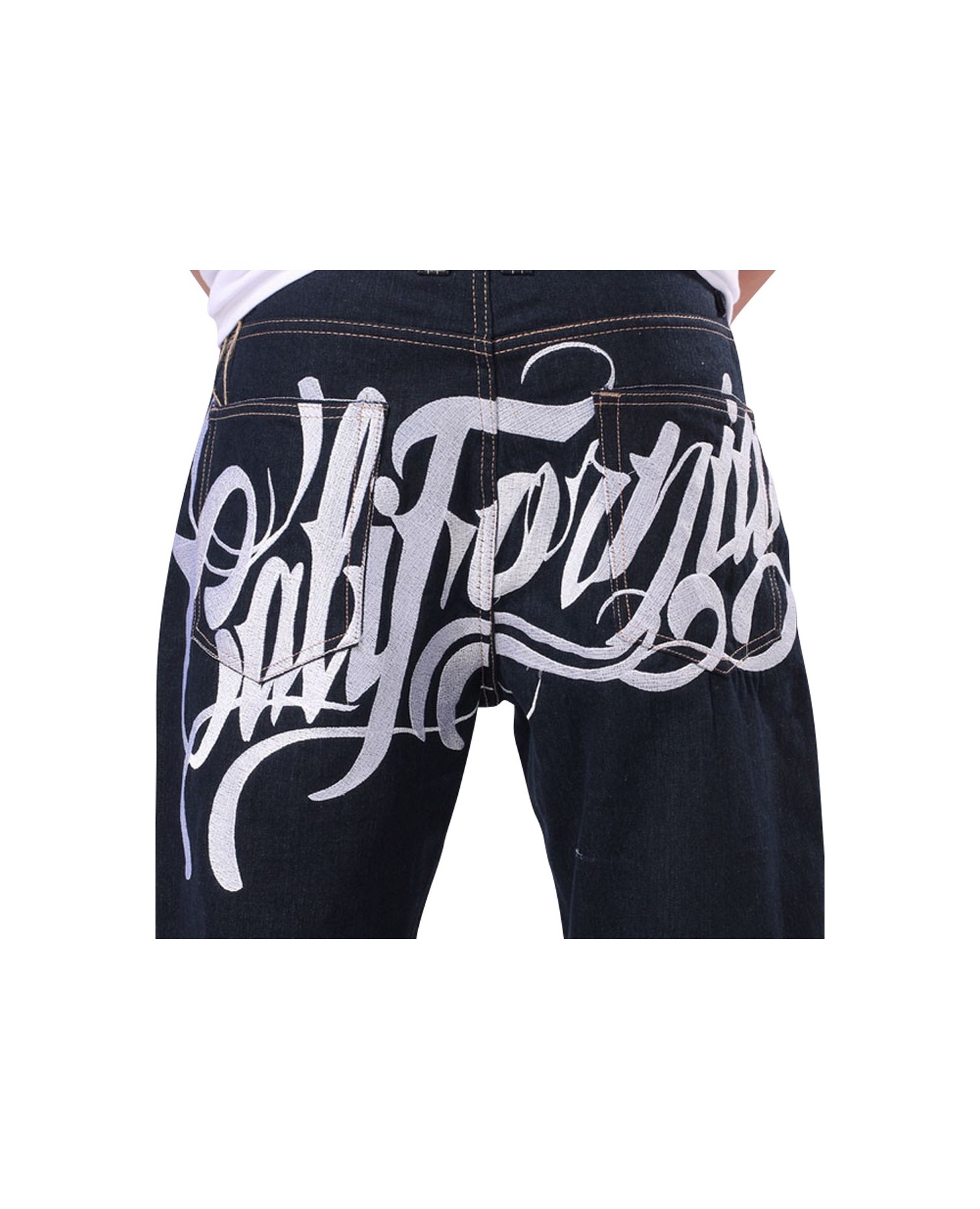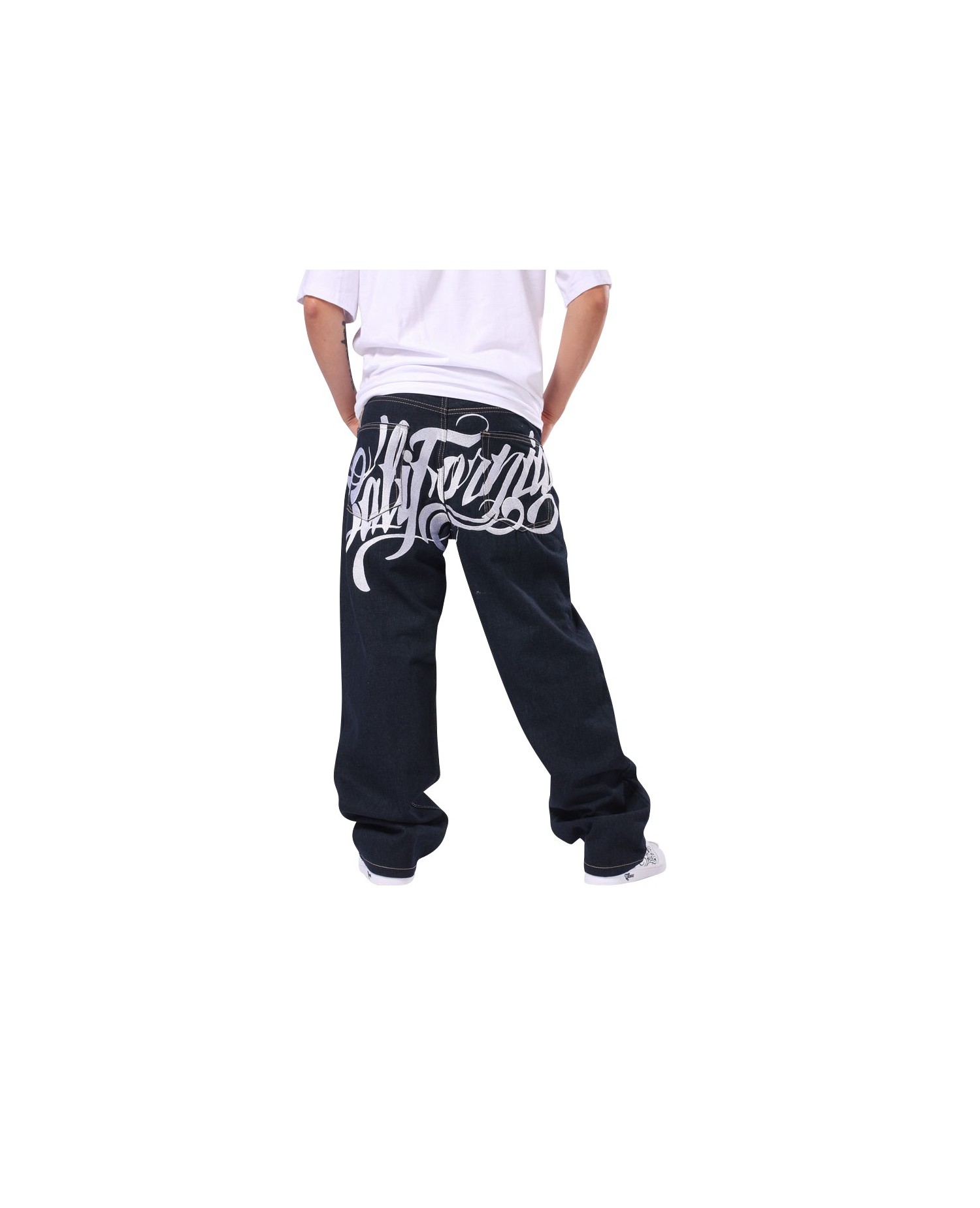 Streetwear farkut Townz Clothingilta. Malli: California. Farkut ovat tummansiniset isolla "California" logolla takana.