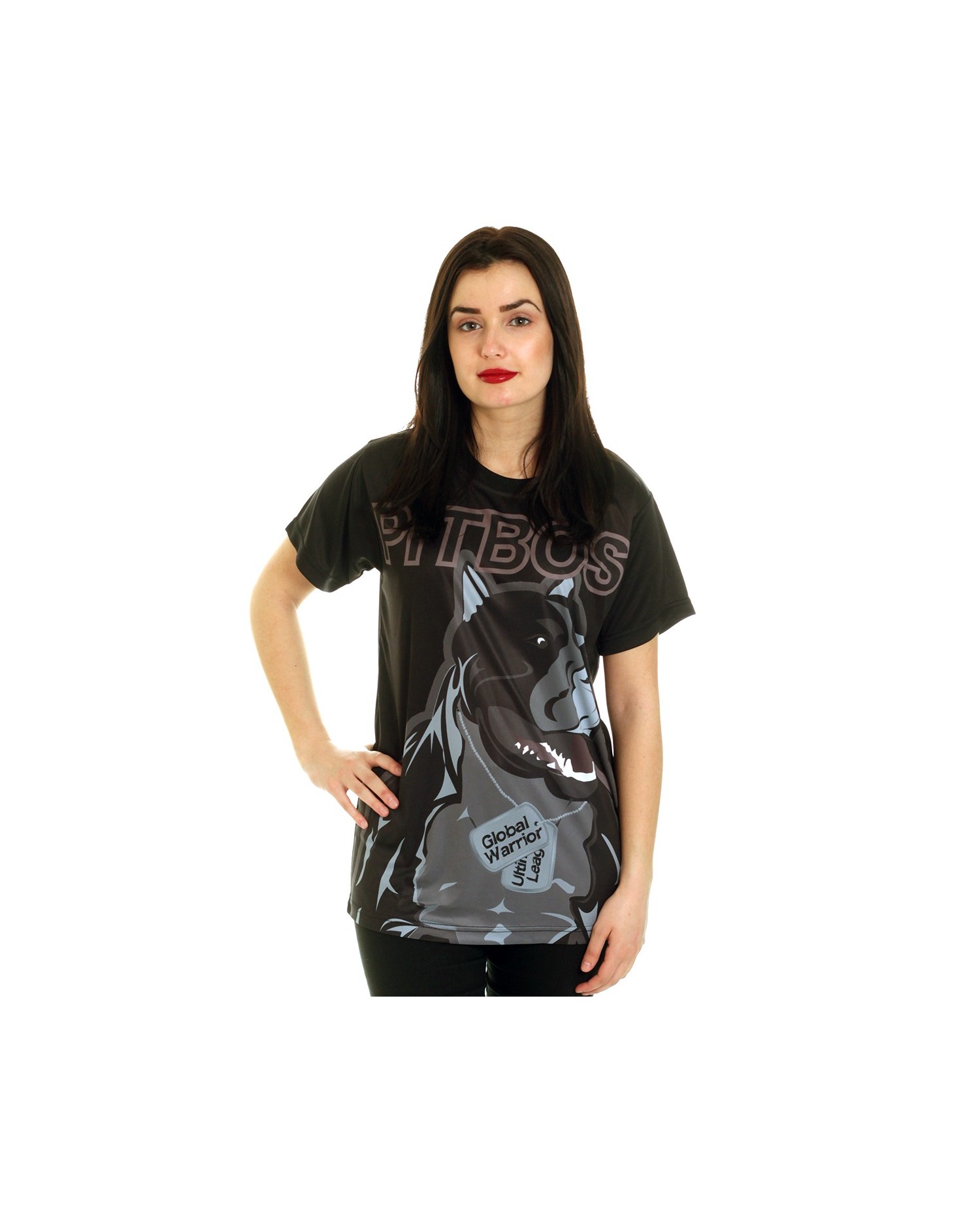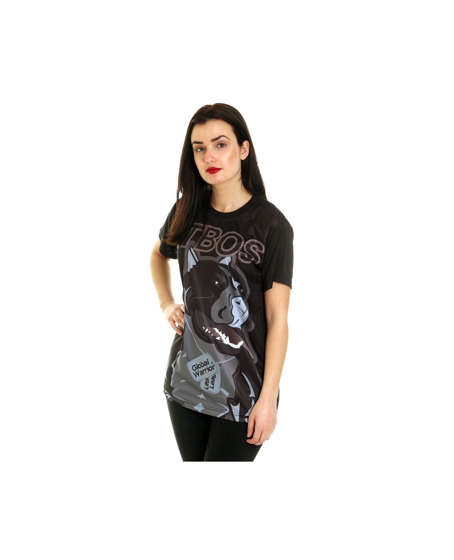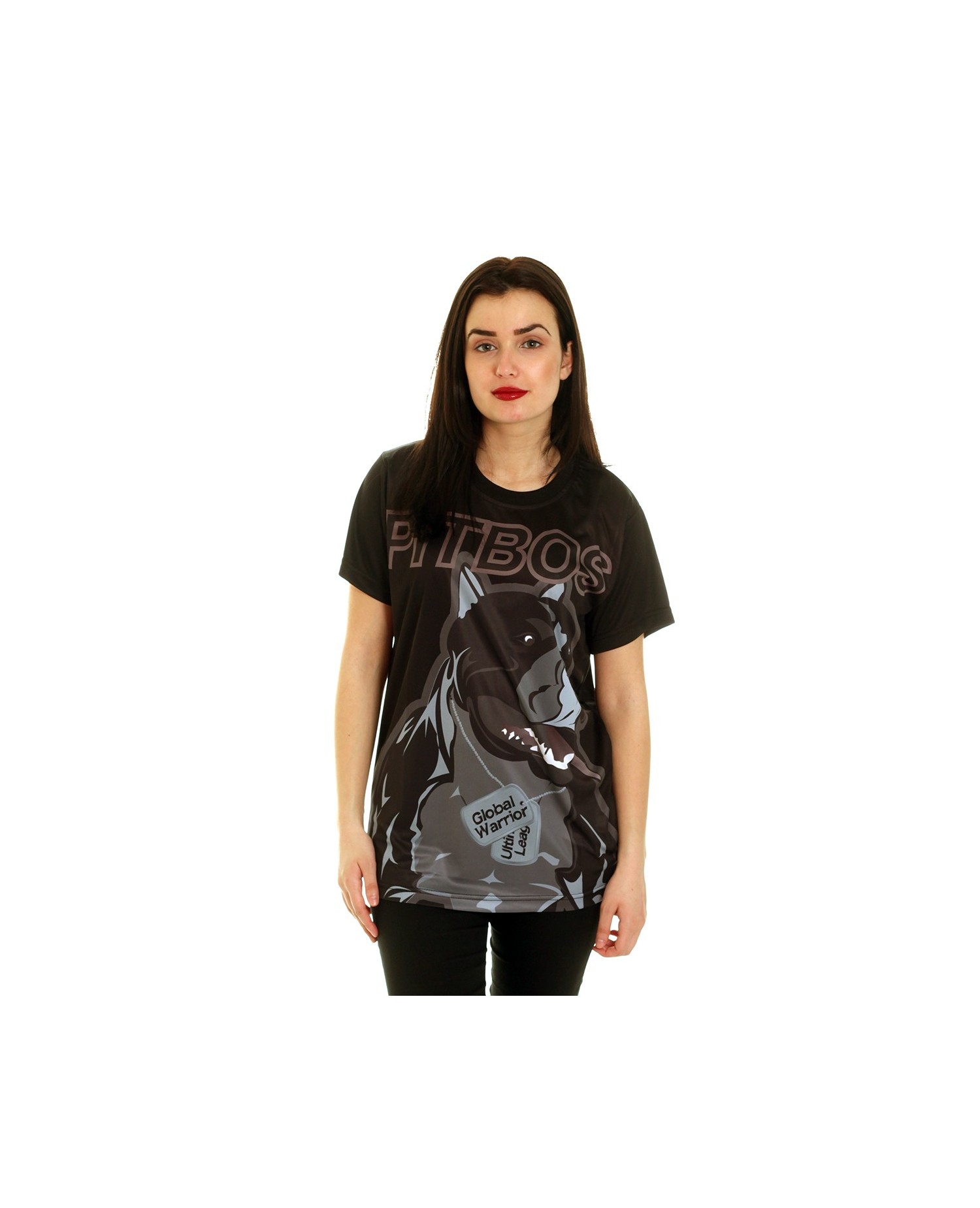 RudeCru hilser Global Warrior familien velkommen :) Den svarte Pitbos Ultimate League Global Warrior hund tilhører her: En våken, sterk og bred dominator som har det til felles med alle de andre Pitbos hunder at den er helt unik og fanden-i-voldsk. Global Warrior Dog designet er avdempet i fargerne men ikke ta feil av det. Den ruler ikke mindre overbevisende, iøynefallende og sterkt på hele ryggen. På t-skjortens forside er det stitchet et mindre grått brandlogo. T-skjorten er laget av et luftig, bløt og ultralett polyester materiale, som minner veldig om det de fleste kjenner fra sportswear. Passformen er oversize.