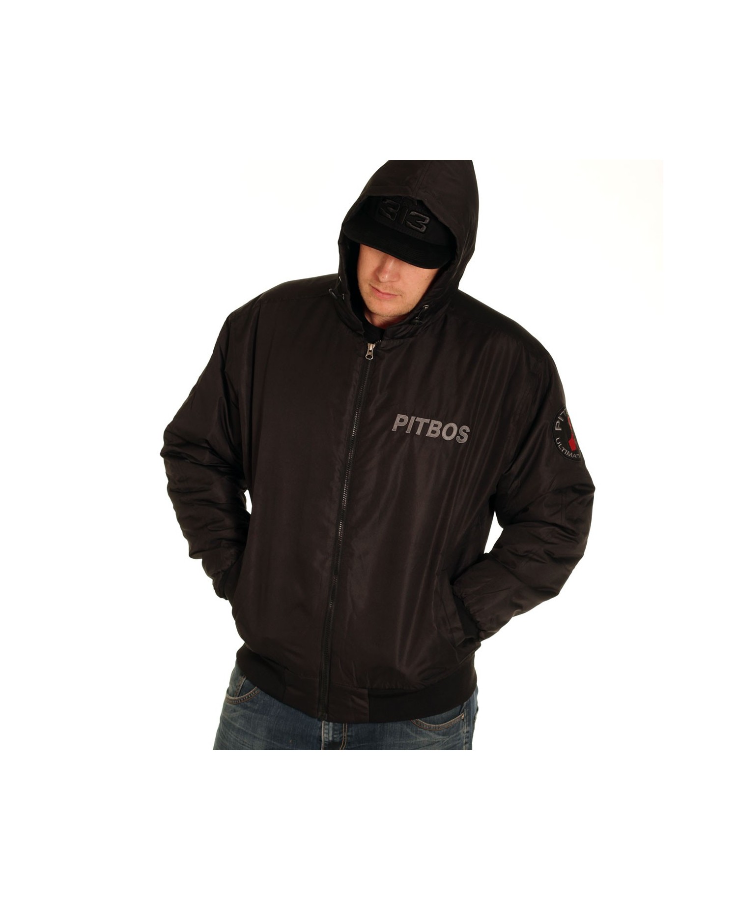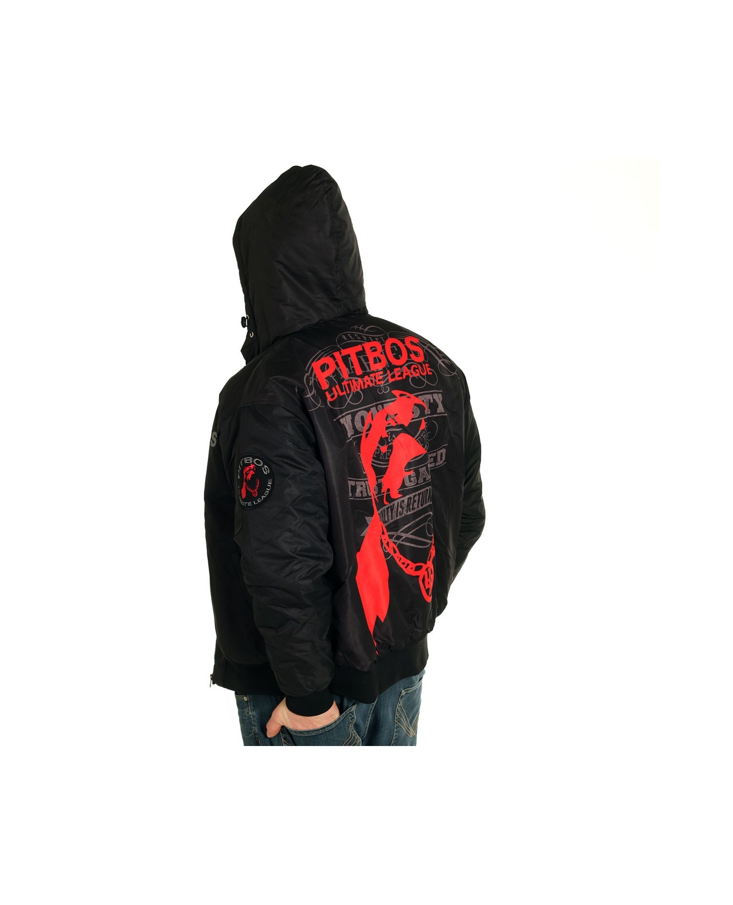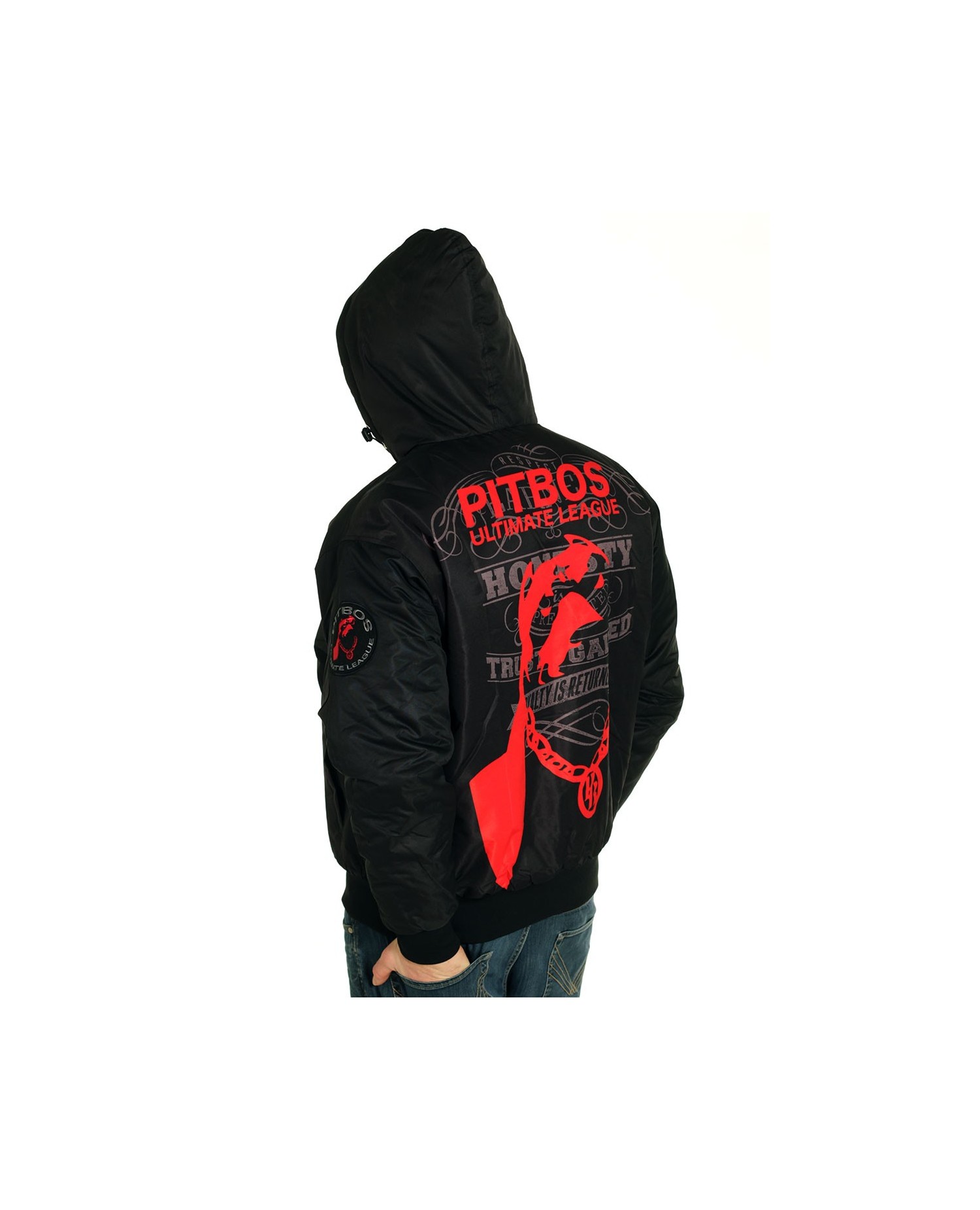 #WhoLetTheDogsOut?! Pitbos5.515 er navnet. Nå kom den ville Ultimate League vinterjakke. Den er svart med grå tekst og rød brandlogo hund. Den kule hund inntar hele ryggen. Vi er digger hunden og dens robuste PB kjetting halskjede og at den ruler på toppen av et sterkt statement, skrevet med grå håndkolorert skrift: Utsagnet lyder: Respect is earned, Honesty is appreciated, Trust is gained, Loyalty is returned. På brystet er det en stitchet grå brandlogo og på venstre overarm troner et rundt brodert brandlogo patch. Vinterjakken har 2 lommer og en praktisk innvendig brystlomme med borrelås lukning, samt praktiske svarte ribkanter.