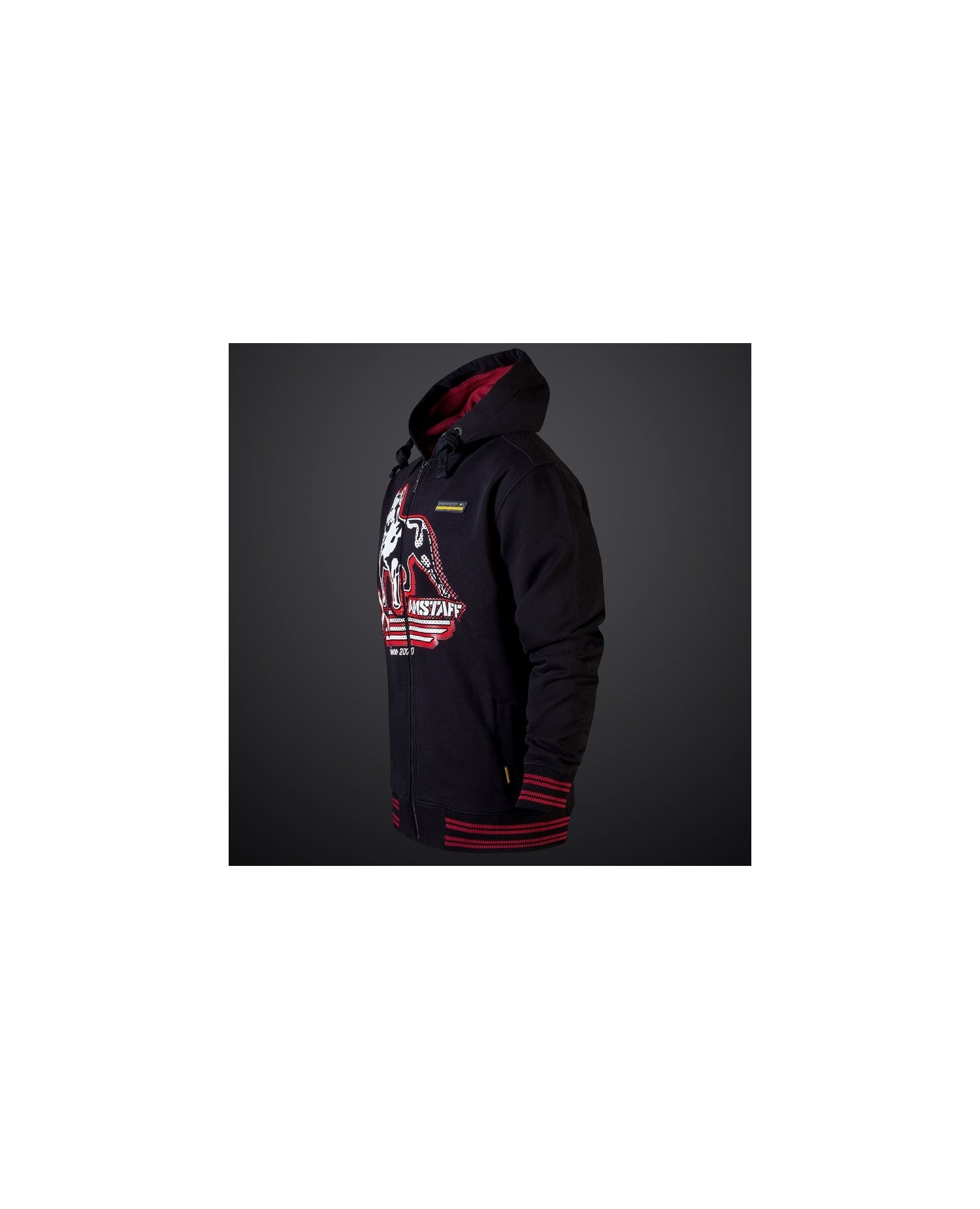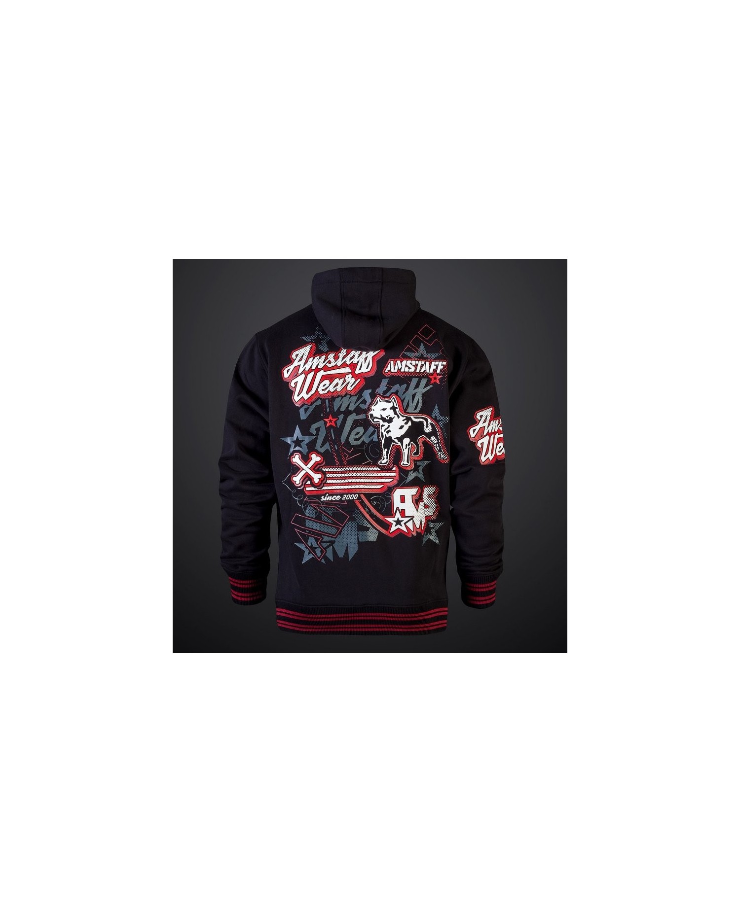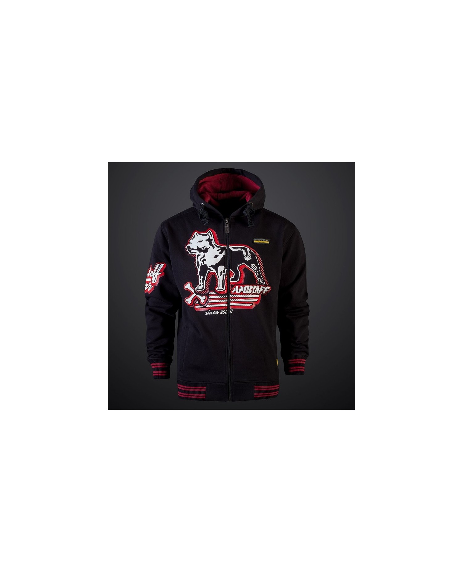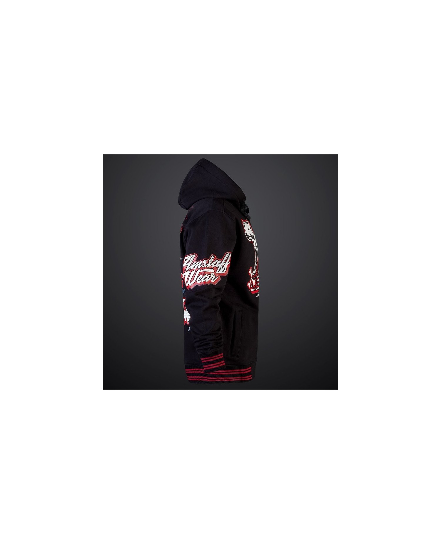 Den sporty, sorte Amstaff Wear ZipHoodie har et et dominant rødt-/hvidt design. Det sportslige udtryk understreges af de sort/rød stribede ribkante.