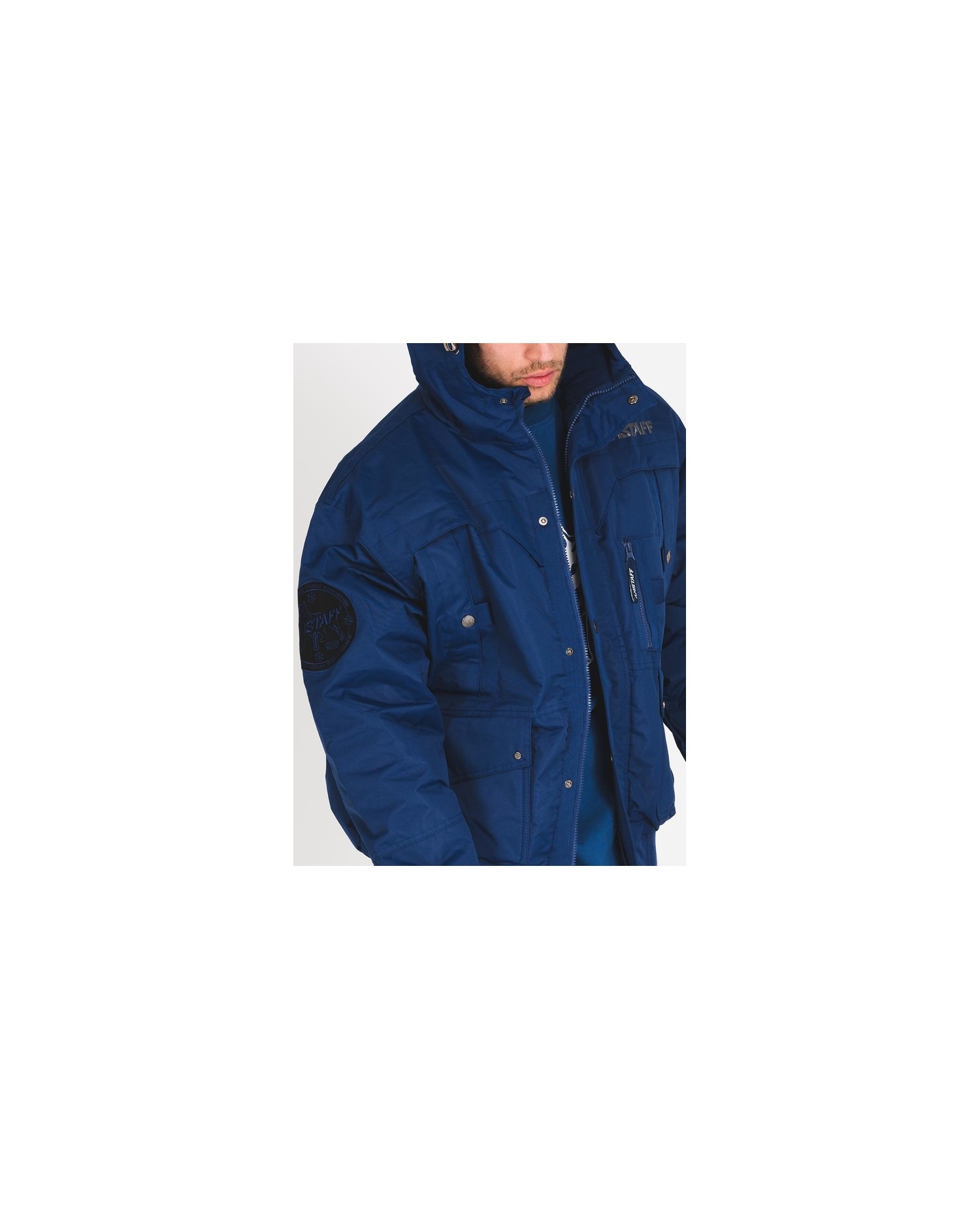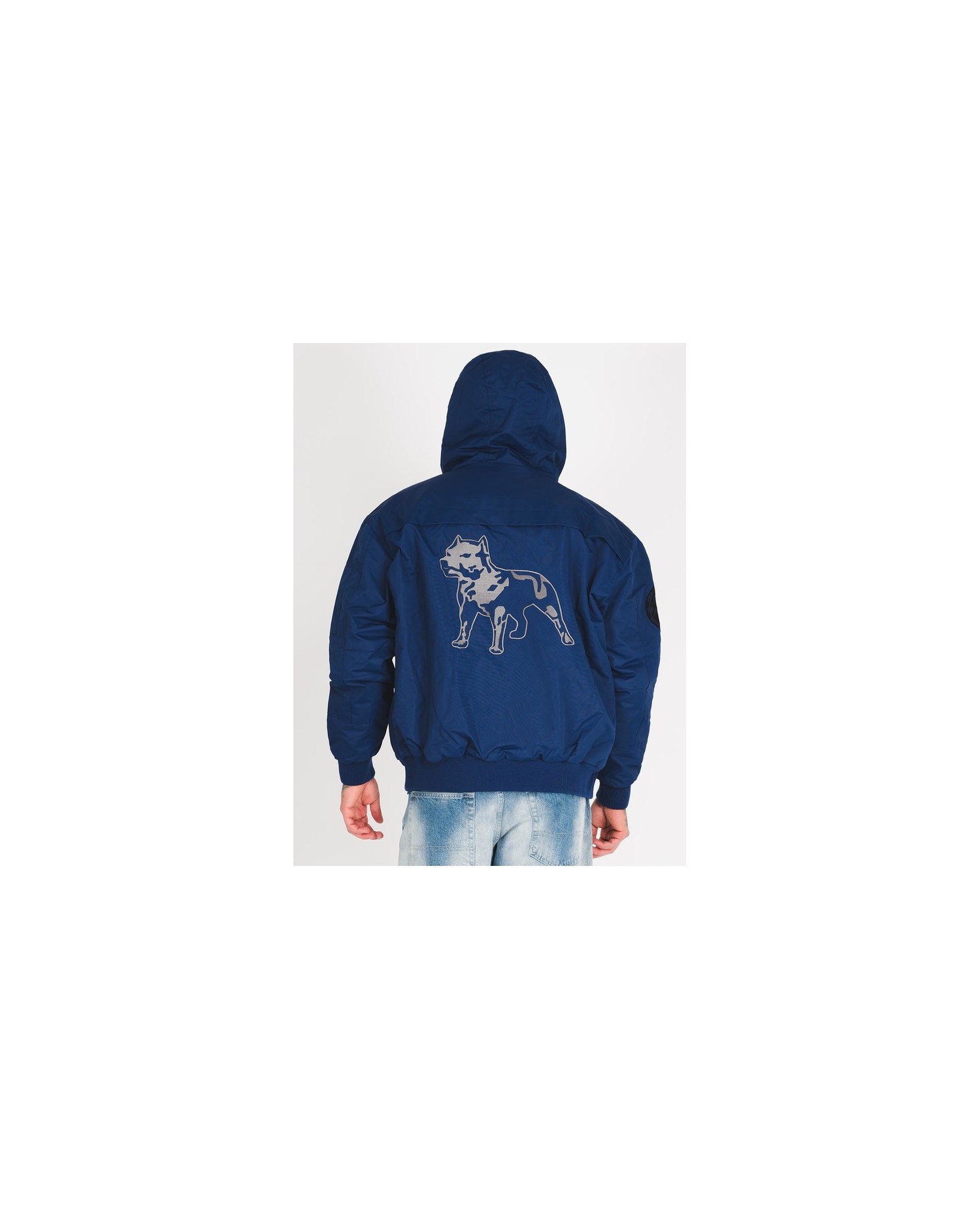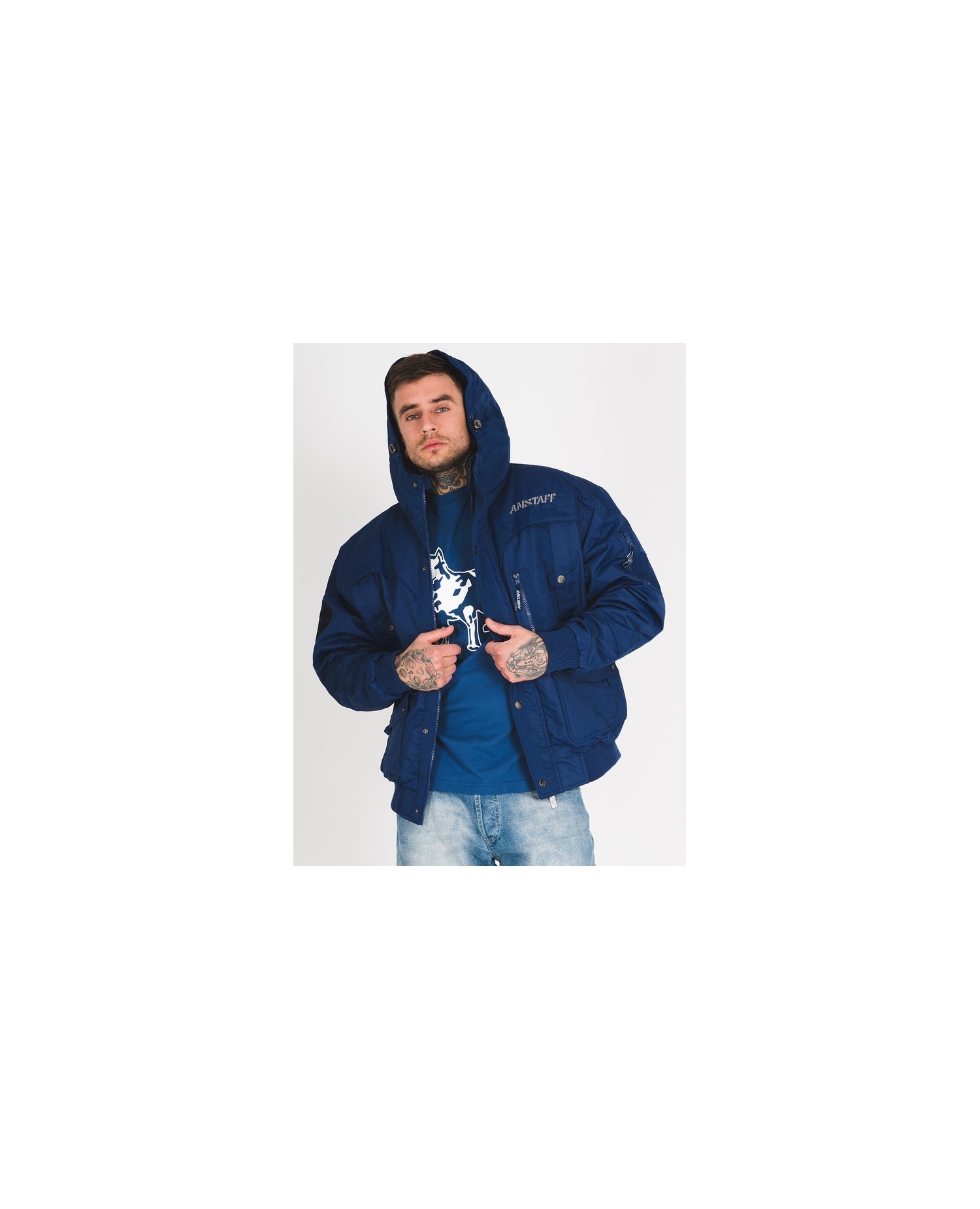 Robust navyblå vinterjakke med hætte fra Dogzdepartement. Forsiden og ærmerne er stitchet med brandets logo. Amstaff og brandets karakteristiske hund med dobbeltvendt ansigt dekorererer jakkens bagside. Jakken er forsynet med behagelig fleece inlining og i lommerne. Materiale: 100% polyester.