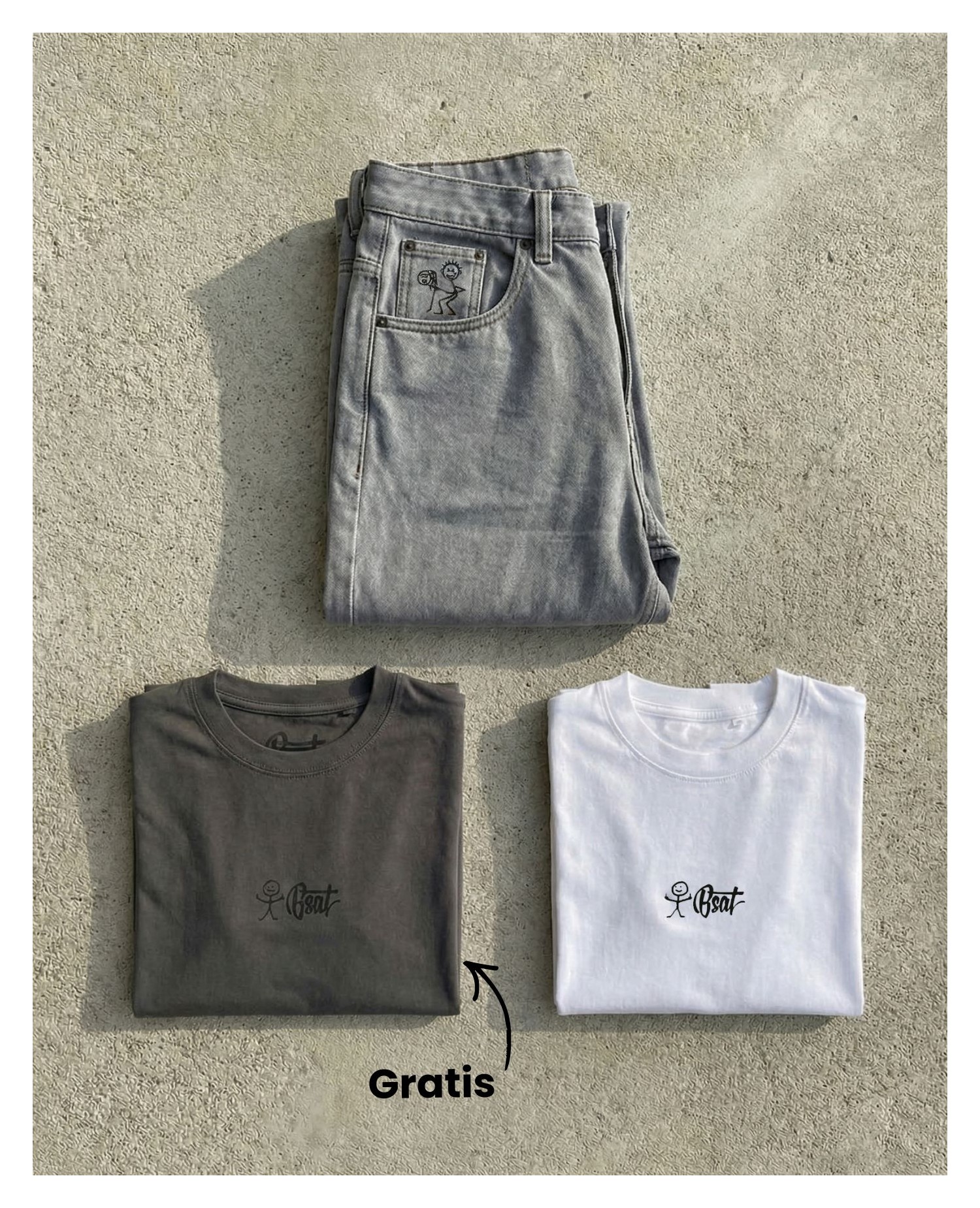 The jeans feature the same relaxed baggy fit many already know from our Stickman styles. The grey denim gives the outfit a cleaner, more versatile look, while the Stickman detail on the coin pocket still carries the attitude BSAT is known for.